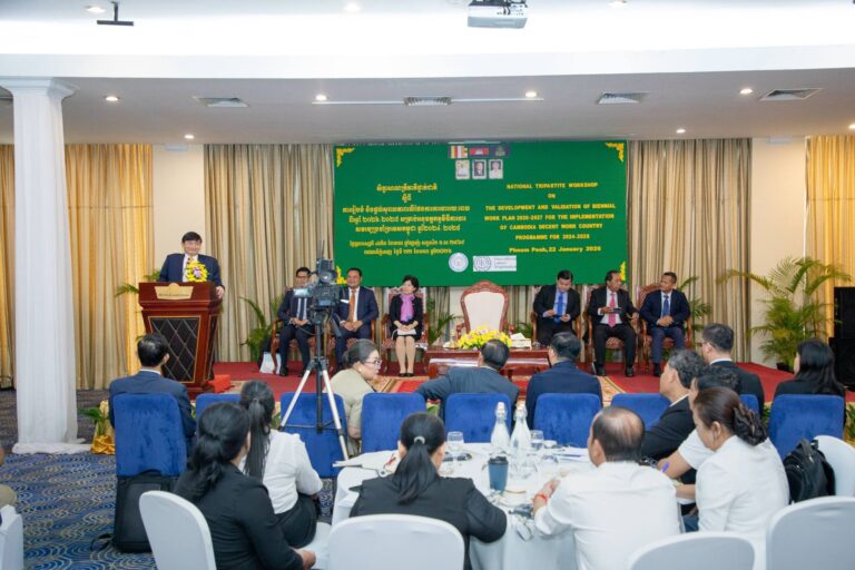 ភ្នំពេញ៖ ឯកឧត្តម ហេង សួរ រដ្ឋមន្ត្រីក្រសួងការងារ និងបណ្តុះបណ្តាលវិជ្ជាជីវៈ បានអញ្ជើញជាអធិបតីក្នុងពិធីបើក “សិក្ខាសាលាត្រីភាគីថ្នាក់ជាតិ ស្ដីពីការរៀបចំ និងផ្តល់សុពលភាពលើផែនការការងាររយៈពេលពីរឆ្នាំ ២០២៦-២០២៧” នារសៀលថ្ងៃទី២២ ខែមករា ឆ្នាំ២០២៦ នៅសណ្ឋាគារកាំបូឌីយ៉ាណា។ សិក្ខាសាលានេះ គឺជាផ្នែកមួយនៃការបន្តអនុវត្តកម្មវិធីការងារសមរម្យប្រចាំប្រទេសកម្ពុជា (DWCP) ឆ្នាំ២០២៤-២០២៨ ដែលមានការចូលរួមពីតំណាងរាជរដ្ឋាភិបាល…
