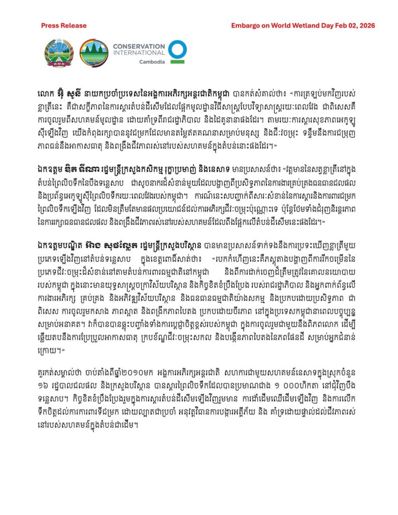 គំហើញវត្តមានសត្វខ្លាត្រីជាថ្មីម្តងទៀតនៅបឹងទន្លេសាប ខេត្តពោធិ៍សាត់ បង្ហាញពីលទ្ធផលវិជ្ជមាននៃការស្តារព្រៃ និងការគ្រប់គ្រងតំបន់ដីសើមនៅកម្ពុជា