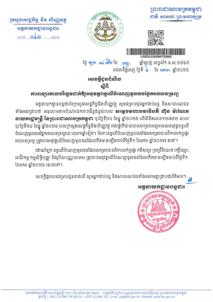ក្នុងសេចក្ដីជូនដំណឹងបានបញ្ជាក់ថា «អនុលោមតាមចំណារឯកភាពដ៏ខ្ពង់ខ្ពស់របស់ សម្តេចមហាបវរធិបតី ហ៊ុន ម៉ាណែត នាយករដ្ឋមន្ត្រីនៃព្រះរាជាណាចក្រកម្ពុជា ចុះថ្ងៃទី២៤ ខែធ្នូ ឆ្នាំ២០២៥ លើលិខិតលេខ១២៧៩២ សហវ ចុះថ្ងៃទី២៤ ខែធ្នូ ឆ្នាំ២០២៥ របស់ក្រសួងសេដ្ឋកិច្ចនិងហិរញ្ញវត្ថុ រាជរដ្ឋាភិបាលបានសម្រេចពន្យារពេលអនុវត្តពន្ធលើ ចំណេញមូលធនផ្នែកអចលនទ្រព្យ រយៈពេល១ឆ្នាំទៀត។ ចំពោះពន្ធលើចំណេញមូលធន ដែលសម្រេចបានពីការលក់ឬផ្ទេរ អចលនទ្រព្យ ត្រូវចាប់អនុវត្តលើចំណេញមូលធនដែលកើតមានឡើងចាប់ពីថ្ងៃទី១ ខែមករា ឆ្នាំ២០២៧ តទៅ»។