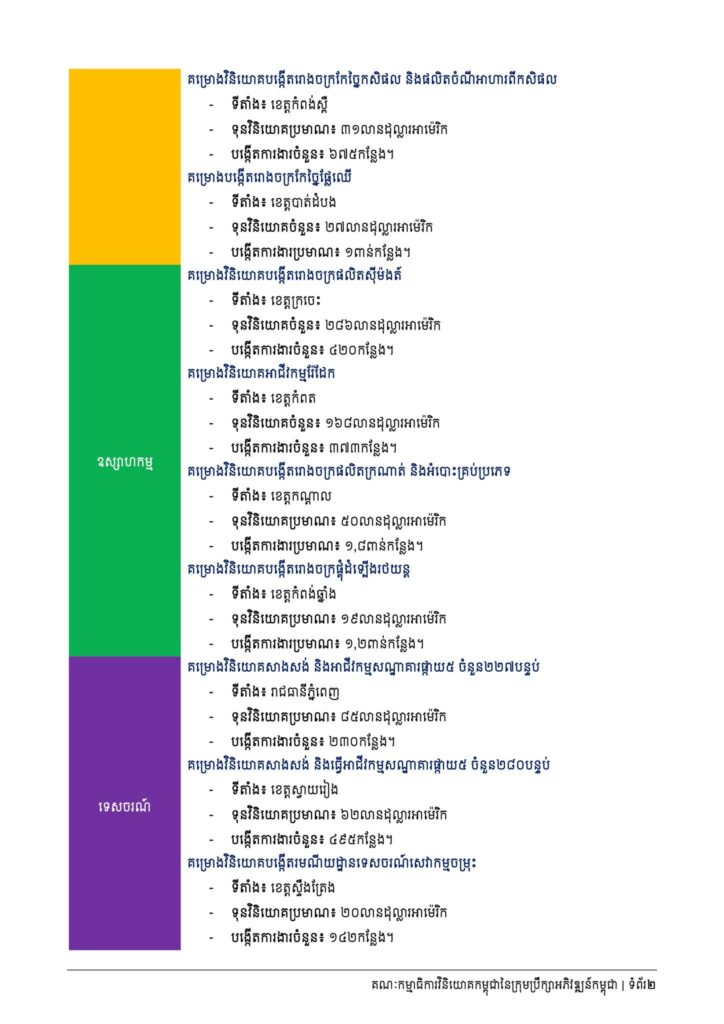ភ្នំពេញ ៖ ក្រុមប្រឹក្សាអភិវឌ្ឍន៍កម្ពុជា បានឱ្យដឹងថា គម្រោងវិនិយោគចំនួន៦៣០ ក្នុងទំហំទុនវិនិយោគសរុបប្រមាណ ១០ប៊ីលានដុល្លារអាម៉េរិក និងអាចបង្កើតការងារបានប្រមាណ ៤៣៨ពាន់កន្លែងត្រូ វបានចុះបញ្ជី ដោយគណៈកម្មាធិការវិនិយោគកម្ពុជា នៃក្រុមប្រឹក្សាអភិវឌ្ឍន៍កម្ពុជា (គ.វ.ក. នៃ ក.អ.ក.) ក្នុងឆ្នាំ២០២៥។