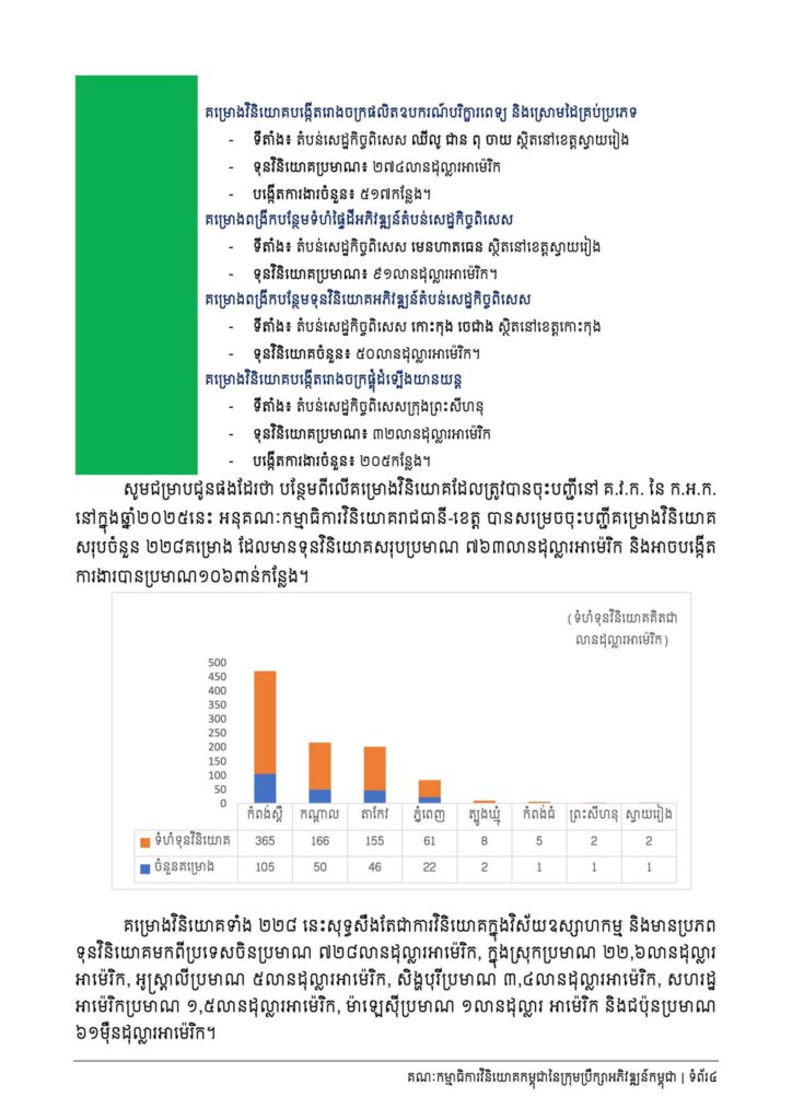 ជាការកត់សម្គាល់ ការចុះបញ្ជីគម្រោងវិនិយោគមានការកើនឡើងចំនួន២១៦ ស្មើនឹងប្រមាណ ៥២% ខណៈទំហំទុនវិនិយោគមានការកើនឡើងប្រមាណ ៣ប៊ីលានដុល្លារអាម៉េរិក ស្មើនឹង ប្រមាណ ៤៥% ធៀបនឹងរយៈពេលដូចគ្នាក្នុងឆ្នាំ២០២៤ ដែល គ.វ.ក. នៃ ក.អ.ក.បានចុះបញ្ជីគម្រោង វិនិយោគចំនួន ៤១៤ ក្នុងទំហំទុនវិនិយោគសរុបប្រមាណ ៦,៩ប៊ីលានដុល្លារអាម៉េរិក។