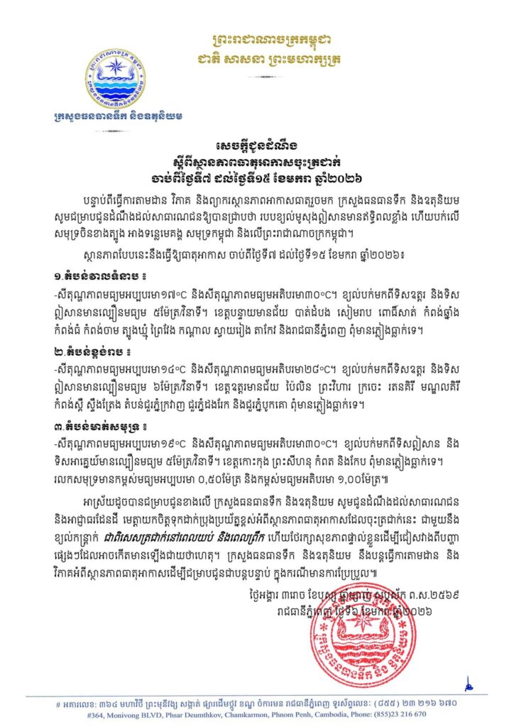 ភ្នំពេញ៖ ក្រសួងធនធានទឹក និងឧតុនិយម បានចេញសេចក្តីជូនដំណឹង ស្តីពីស្ថានភាពធាតុអាកាសចុះត្រជាក់ ចាប់ពីថ្ងៃទី៧ ដល់ថ្ងៃទី១៥ ខែមករា ឆ្នាំ២០២៦។