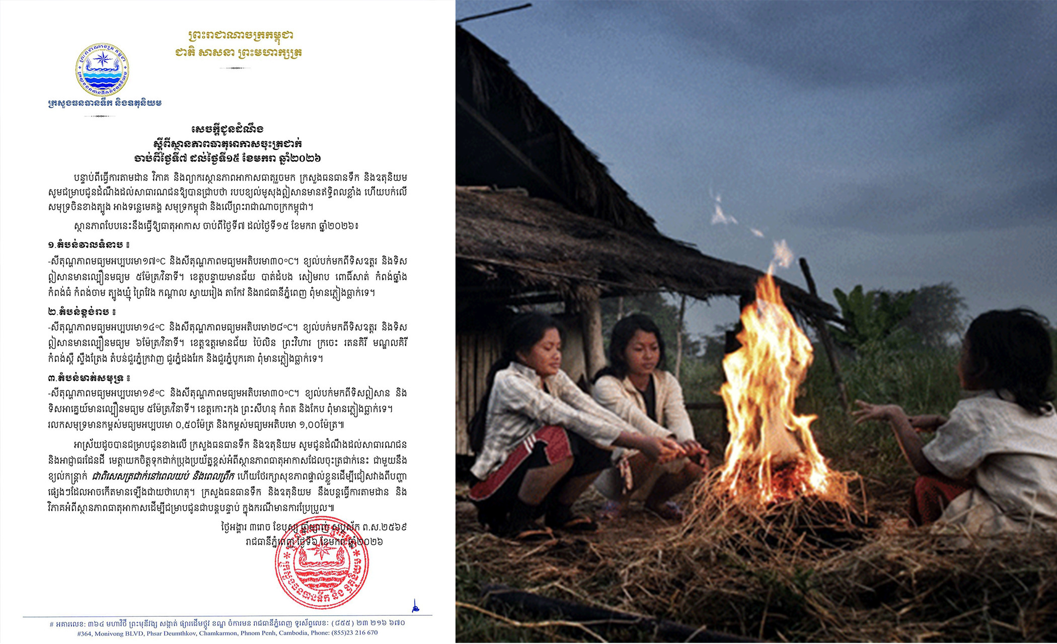 ក្រសួងបញ្ជាក់ថា របបខ្យល់មូសុងឦសានមានឥទ្ធិពលខ្លាំង ហើយបក់លើសមុទ្រចិនខាងត្បូង អាងទន្លេមេគង្គ សមុទ្រកម្ពុជា និងលើព្រះរាជាណាចក្រកម្ពុជា, ស្ថានភាពបែបនេះនឹងធ្វើឱ្យធាតុអាកាស ចាប់ពីថ្ងៃទី៧ ដល់ថ្ងៃទី១៥ ខែមករា ឆ្នាំ២០២៦៖