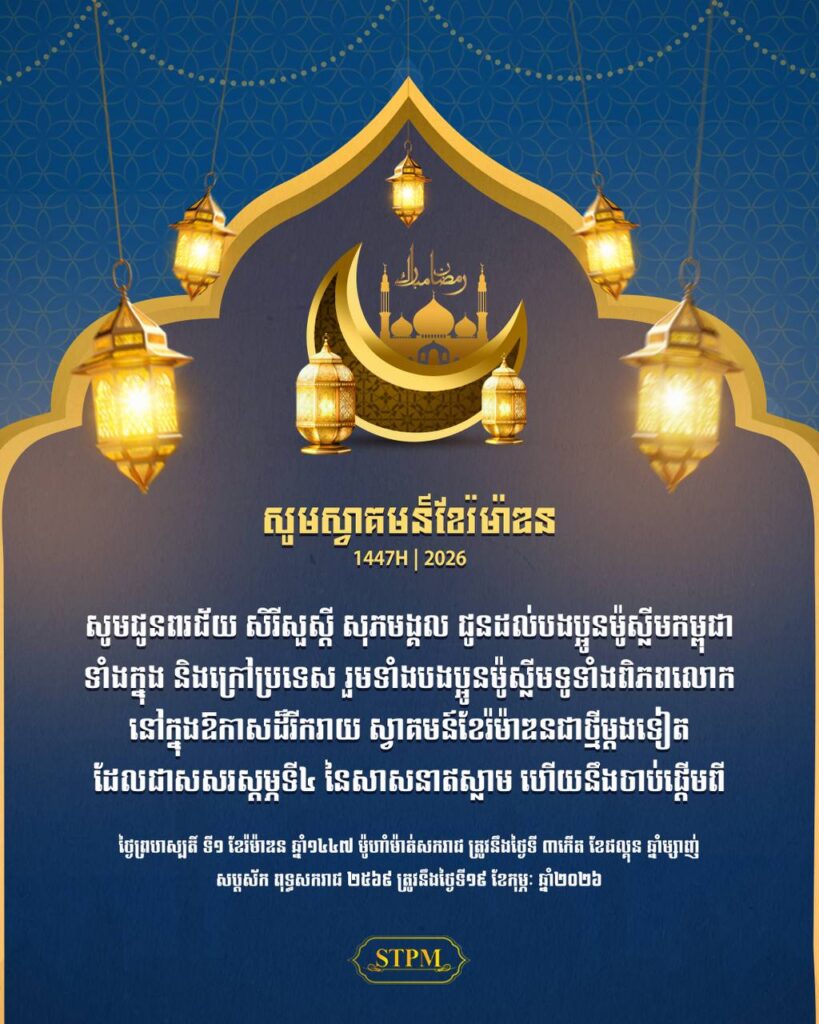 ជាថ្មីម្តងទៀត ខ្ញុំសូមព្រះអល់ឡោះប្រទានពរជ័យ សិរីសួស្តីដល់បងប្អូនមូស្លីមកម្ពុជាទាំងក្នុង និងក្រៅប្រទេស ព្រមទាំងបងប្អូនមូស្លីមលើសាកលលោក សូមជួបប្រទះតែសេចក្តីសុខ សុភមង្គល និងជោគជ័យក្នុងកិច្ចប្រតិបត្តិជំនឿសាសនាឥស្លាម អំឡុងខែបួសរ៉ម៉ាឌន ឆ្នាំ២០២៦ នេះ កុំបីឃ្លៀងឃ្លាតឡើយ៕