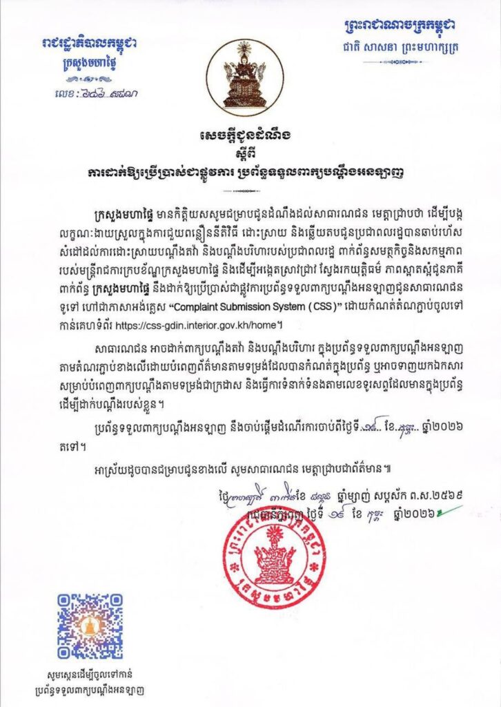 យោងតាមសេចក្ដីជូនដំណឹងរបស់ ក្រសួងមហាផ្ទៃ នាថ្ងៃទី១៩ ខែកុម្ភៈ ឆ្នាំ២០២៦ ថា ដើម្បីបង្កលក្ខណៈងាយស្រួលក្នុងការជួយពន្លឿននីតិវិធី ដោះស្រាយ និងឆ្លើយតបជូនប្រជាពលរដ្ឋបានឆាប់រហ័ស សំដៅដល់ការដោះស្រាយបណ្តឹងតវ៉ា និងបណ្តឹងបរិហារបស់ប្រជាពលរដ្ឋ ពាក់ព័ន្ធសមត្ថកិច្ច និងសកម្មភាពរបស់មន្ត្រីរាជការក្របខ័ណ្ឌក្រសួងមហាផ្ទៃ និងដើម្បីអង្កេតស្រាវជ្រាវ ស្វែងរកយុត្តិធម៌ ភាពស្អាតស្អំជូនភាគីពាក់ព័ន្ធ ក្រសួងមហាផ្ទៃ នឹងដាក់ឱ្យប្រើប្រាស់ជាផ្លូវការប្រព័ន្ធទទួលពាក្យបណ្តឹងអនឡាញជូនសាធារណជនទូទៅ ហៅជាភាសាអង់គ្លេស «Complaint Submission System (CSS)» ដោយកំណត់តំណភ្ជាប់ចូលទៅ កាន់គេហទំព័រ https://css-gdin.interior.gov.kh/home។