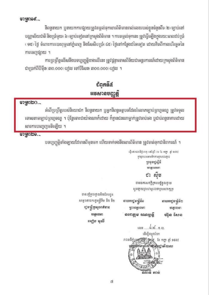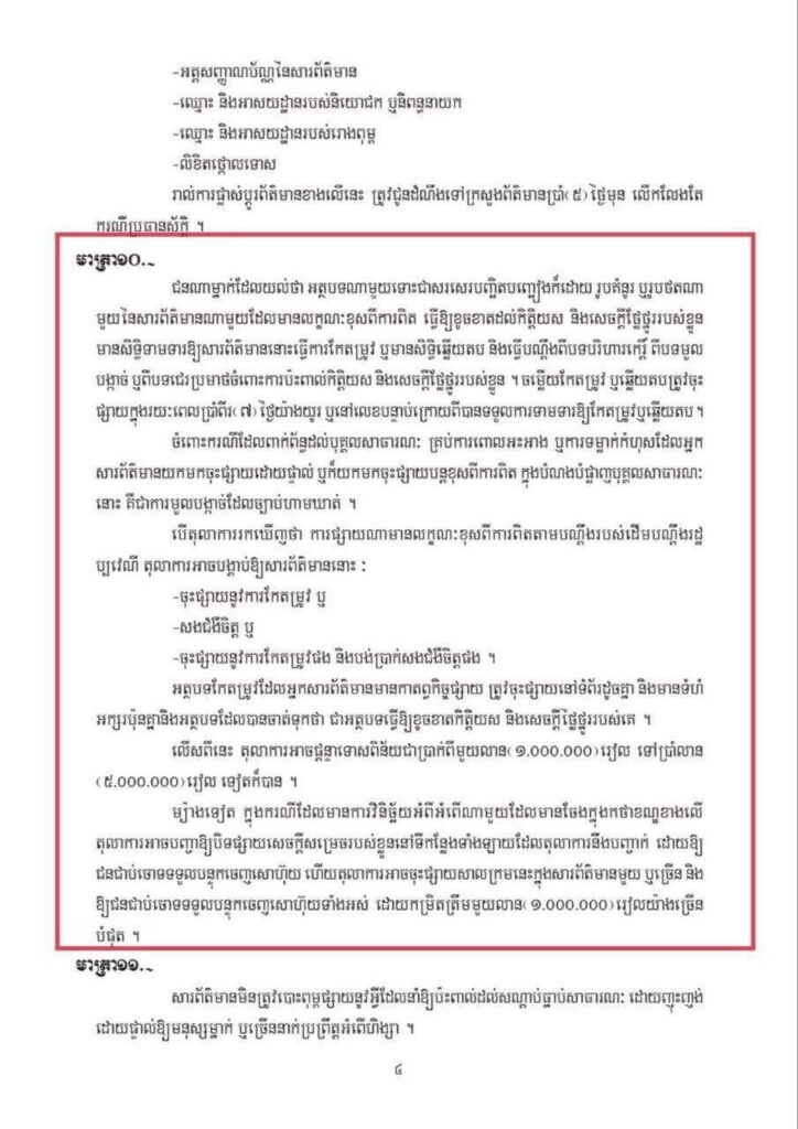 ការធ្វើបែបនេះគឺមិនអនុលោមតាមច្បាប់ស្តីពីរបបសារព័ត៌មាន ដែលមានជាធរមាន និងបង្កឱ្យប៉ះពាល់ដល់គោលនយោបាយ រាជរដ្ឋាភិបាល ដែលកំពុងខិតខំប្រឹងប្រែងកសាងសង្គមជាតិមួយប្រកបដោយ នីតិរដ្ឋ និងមានសុខដុមរមនា។ ផ្ទុយទៅវិញ ការអនុវត្តដូចខាងលើ បានបង្កើតជារូបភាពឱ្យទៅបរទេសចាប់យកជាមូលដ្ឋានធ្វើជារបាយការណ៍ និងវាយតម្លៃចោទប្រកាន់ដោយអយុត្តិធម៌មកលើរាជរដ្ឋាភិបាលកម្ពុជា ថាបំភិតបំភ័យ បំបាក់ស្មារតី និងធ្វើទុក្ខបុក ម្នេញលើសេរីភាពសារព័ត៌មាននិងសិទ្ធិបញ្ចេញមតិ។