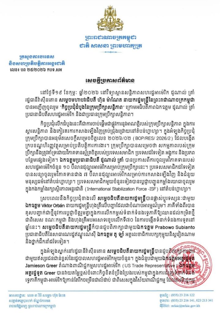 គួររំលឹកថា កាលពីថ្ងៃទី១៩ ខែកុម្ភៈ ឆ្នាំ២០២៦ នៅវិទ្យាស្ថានសន្តិភាពសហរដ្ឋអាម៉េរិក ដូណាល់ ត្រាំ រដ្ឋធានីវ៉ាស៊ីនតោន សម្តេចមហាបវរធិបតី ហ៊ុន ម៉ាណែត នាយករដ្ឋមន្ត្រីនៃព្រះរាជាណាចក្រកម្ពុជា បានអញ្ជើញចូលរួម «កិច្ចប្រជុំដំបូងនៃក្រុមប្រឹក្សាសន្តិភាព» ក្រោមអធិបតីភាពលោក ដូណាល់ ត្រាំ ប្រធានាធិបតីសហរដ្ឋអាម៉េរិក និងជាប្រធានក្រុមប្រឹក្សាសន្តិភាព។