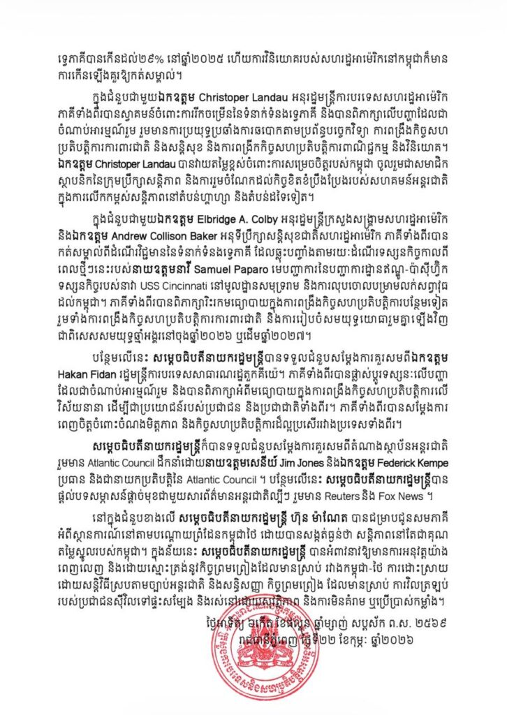 ក្នុងជំនួបជាមួយឯកឧត្តម Christoper Landau អនុរដ្ឋមន្ត្រីការបរទេសសហរដ្ឋអាម៉េរិក ភាគីទាំងពីរបានស្វាគមន៍ចំពោះការរីកចម្រើន នៃទំនាក់ទំនងទ្វេភាគី និងបានពិភាក្សាលើបញ្ហាដែលជាចំណាប់អារម្មណ៍រួម រួមមានការប្រយុទ្ធប្រឆាំងការឆបោកតាមប្រព័ន្ធបច្ចេកវិទ្យា ការពង្រឹងកិច្ចសហប្រតិបត្តិការការពារជាតិ និងសន្តិសុខ និងការពង្រីកកិច្ចសហប្រតិបត្តិការពាណិជ្ជកម្ម និងវិនិយោគ។