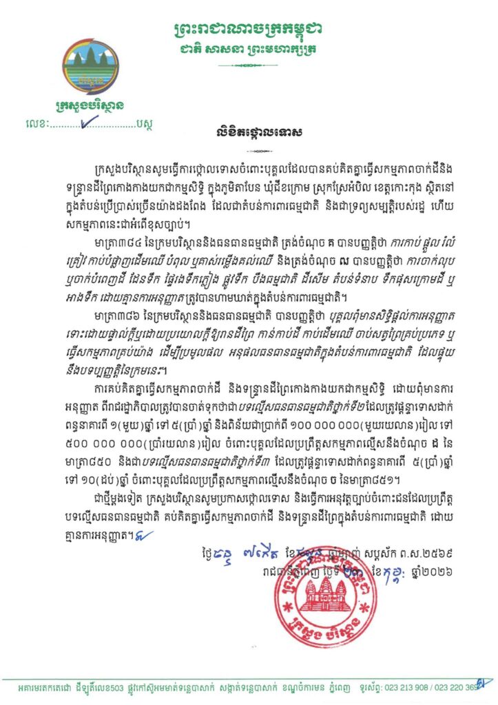 ជាថ្មីម្តងទៀត ក្រសួងបរិស្ថាន បានប្រកាសថ្កោលទោស និងធ្វើការអនុវត្តច្បាប់ ចំពោះជនដែលប្រព្រឹត្ត បទល្មើសធនធានធម្មជាតិ គប់គិតគ្នាធ្វើសកម្មភាពចាក់ដី និងទន្ទ្រានដីព្រៃក្នុងតំបន់ការពារធម្មជាតិ ដោយ គ្មានការអនុញ្ញាត៕