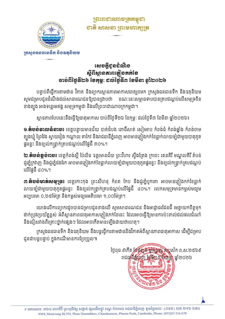 យោងតាមសេចក្ដីជូនដំណឹងរបស់ ក្រសួងធនធានទឹក និងឧតុនិយម នៅថ្ងៃទី២៥ ខែកុម្ភៈ ឆ្នាំ២០២៦ បានឱ្យដឹងថា បន្ទាប់ពីធ្វើការតាមដាន វិភាគ និងព្យាករស្ថានភាពអាកាសធាតុរួចមក ក្រសួងធនធានទឹក ថា ខណៈនេះសម្ពាធទាបបានគ្របដណ្តប់លើសមុទ្រចិន ខាងត្បូង អាងទន្លេមេគង្គ សមុទ្រកម្ពុជា និងលើព្រះរាជាណាចក្រកម្ពុជា។