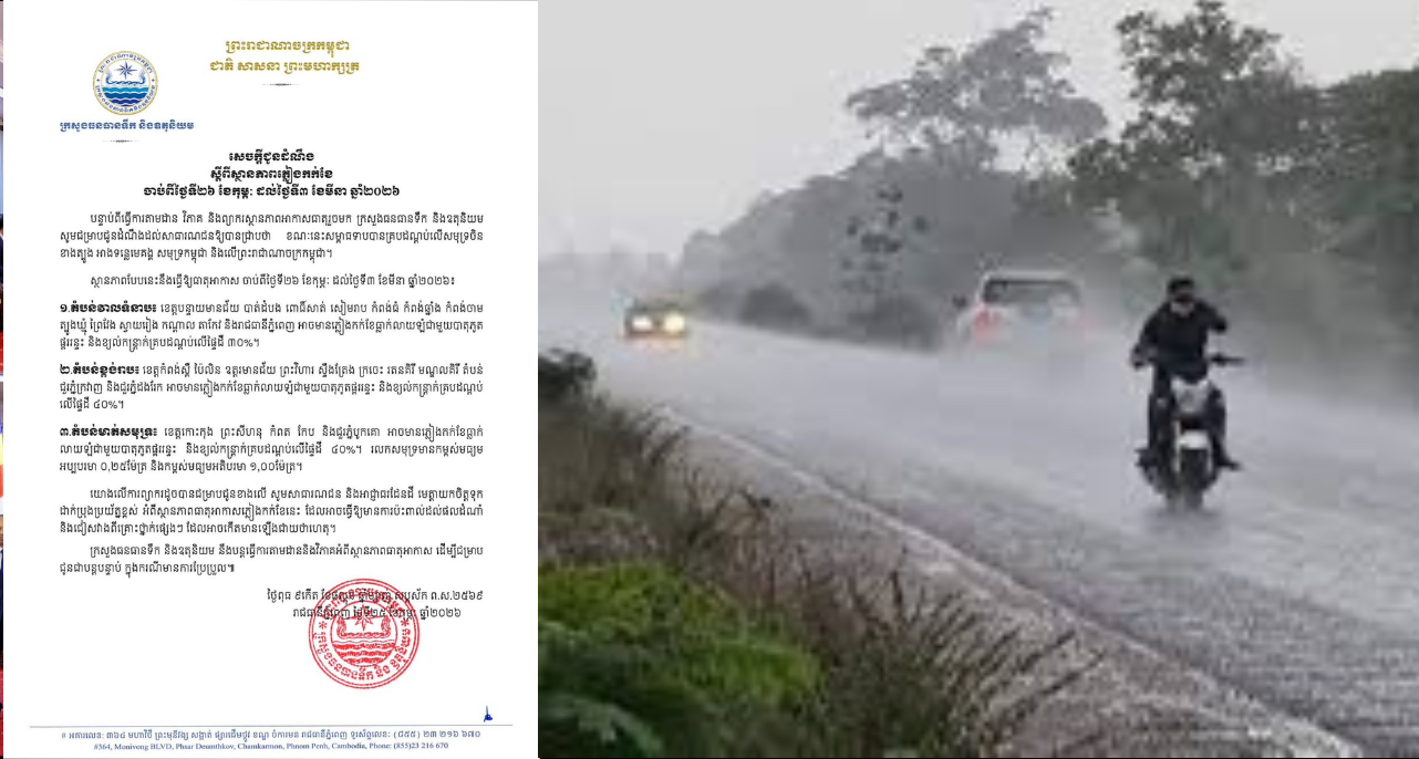 ក្រសួងធនធានទឹក ណែនាំឱ្យប្រុងប្រយ័ត្នខ្ពស់ ចំពោះភ្លៀងកក់ខែ ចាប់ពីថ្ងៃទី២៦ កុម្ភៈ ដល់ថ្ងៃទី៣ មីនា