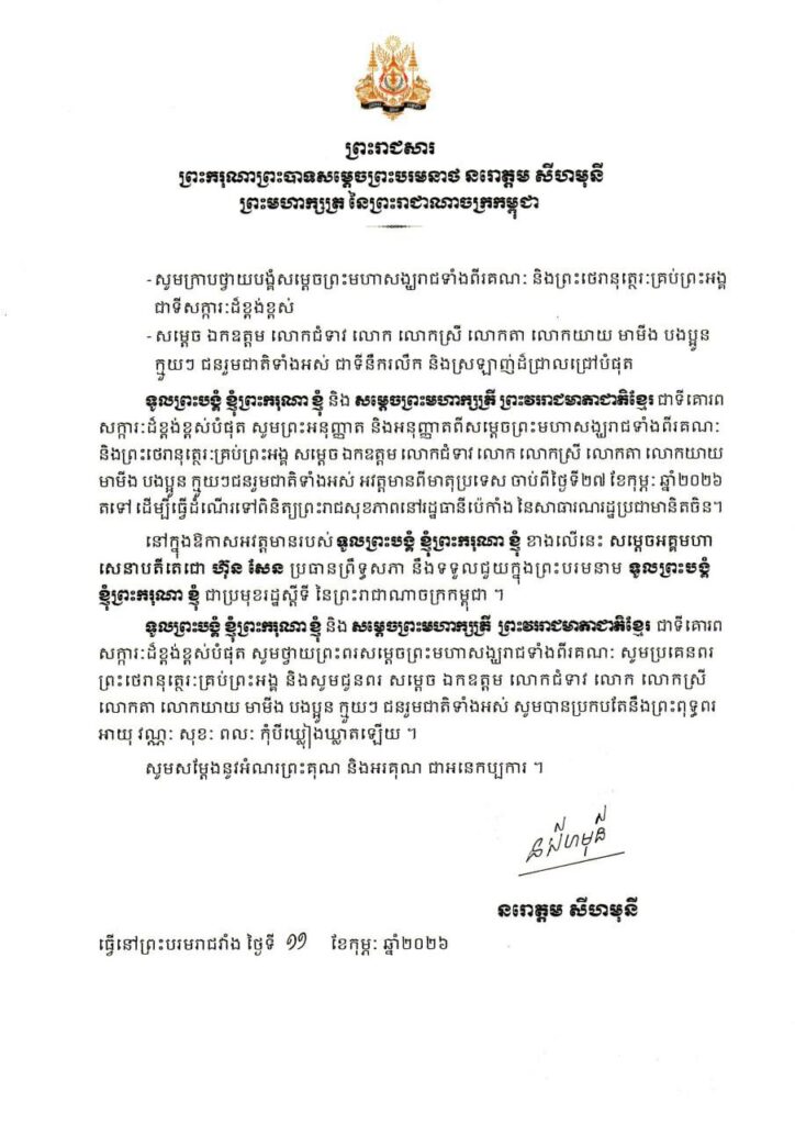 ភ្នំពេញ ៖ សម្តេចព្រះមហាក្សត្រី ព្រះវររាជមាតាជាតិខ្មែរ និងព្រះករុណាព្រះបាទសម្តេចព្រះបរមនាថ នរោត្តម សីហមុនី ព្រះមហាក្សត្រកម្ពុជា នឹងស្តេចយាងធ្វើដំណើរទៅពិនិត្យព្រះរាជសុខភាពនៅរដ្ឋធានីប៉េកាំង នៃប្រទេសចិន នៅថ្ងៃទី២៧ ខែកុម្ភៈ ឆ្នាំ២០២៦ ស្អែកនេះ ។