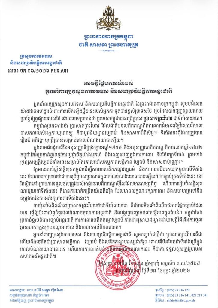 យោងតាមសេចក្តីថ្លែងការណ៍របស់ អ្នកនាំពាក្យក្រសួងការបរទេស និងសហប្រតិបត្តិការអន្តរជាតិ នៅថ្ងៃទី២៧ ខែកុម្ភៈ ឆ្នាំ២០២៦ ថា «សូមបដិសេធយ៉ាងដាច់អហង្ការចំពោះការលើកឡើងថ្មីៗនេះ របស់អ្នកការទូតជាន់ខ្ពស់ប្រទេសថៃ ដូចដែលបានផ្សព្វផ្សាយដោយ ប្រព័ន្ធផ្សព្វផ្សាយរបស់ថៃ ដោយចោទប្រកាន់ថា ប្រទេសកម្ពុជាបានប្រើប្រាស់ ប្រាសាទព្រះវិហារ ជាទីតាំងយោធា»។