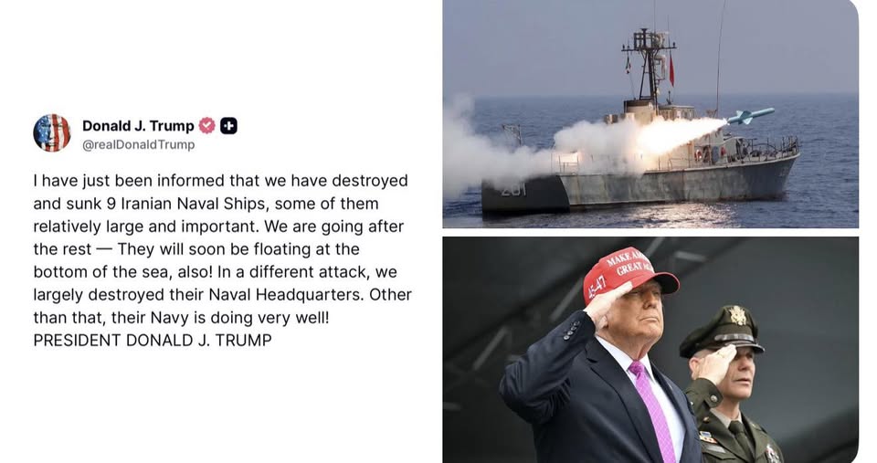 លោក ត្រាំ នៅក្នុងការបង្ហោះលើបណ្ដាញទំនាក់ទំនងសង្គម Truth Social បានសរសេរថា «ខ្ញុំទើបតែទទួលបានព័ត៌មានថាយើងបានបំផ្លាញ និងពន្លិចនាវាចម្បាំង៩គ្រឿងរបស់ អ៊ីរ៉ង់…នៅក្នុងការវាយប្រហារផ្សេងមួយទៀត យើងបានកម្ទេចទីស្នាក់ការកងទ័ពជើងទឹករបស់ពួកគេមួយផ្នែកធំ»។