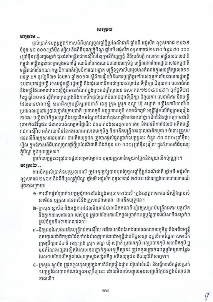 រាជរដ្ឋាភិបាលផ្តល់ប្រាក់ឧបត្ថម្ភ ៥ម៉ឺនរៀលដល់មន្ត្រីរាជការ កម្លាំងប្រដាប់អាវុធ ក្នុងឱកាសបុណ្យចូលឆ្នាំថ្មីប្រពៃណីជាតិ និងបុណ្យភ្ជុំបិណ្ឌ