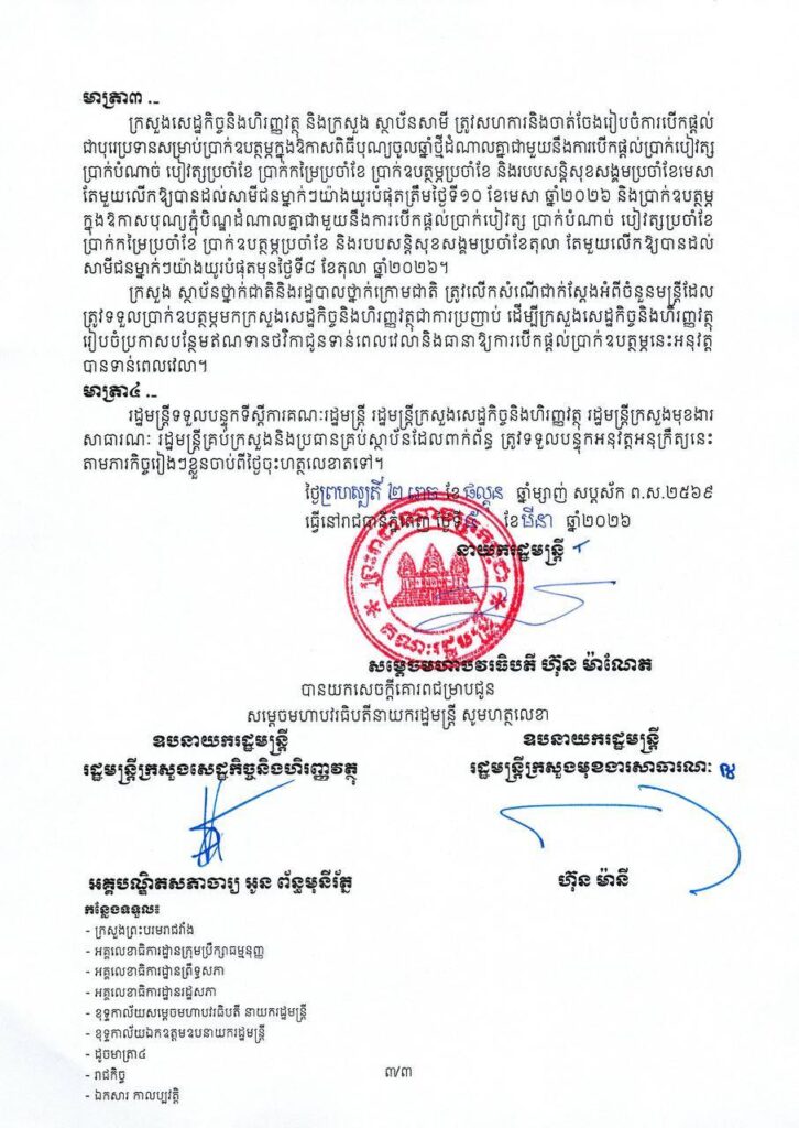 ភ្នំពេញ៖ សម្តេចបវរធិបតី ហ៊ុន ម៉ាណែត នាយករដ្ឋមន្ត្រីនៃកម្ពុជា បានចេញអនុក្រឹត្យ ស្តីពីការផ្តល់ប្រាក់ឧបត្ថម្ភចំនួន៥ម៉ឺន រៀល ដល់មន្ត្រីរាជការ និងកម្លាំងប្រដាប់អាវុធ ក្នុងឱកាសពិធីបុណ្យចូលឆ្នាំថ្មី ប្រពៃណីជាតិ ឆ្នាំមមី អដ្ឋស័ក ពុទ្ធសករាជ ២៥៦៩ និងពិធីបុណ្យភ្ជុំបិណ្ឌ ឆ្នាំមមី អដ្ឋស័ក ពុទ្ធសករាជ ២៥៧០៕