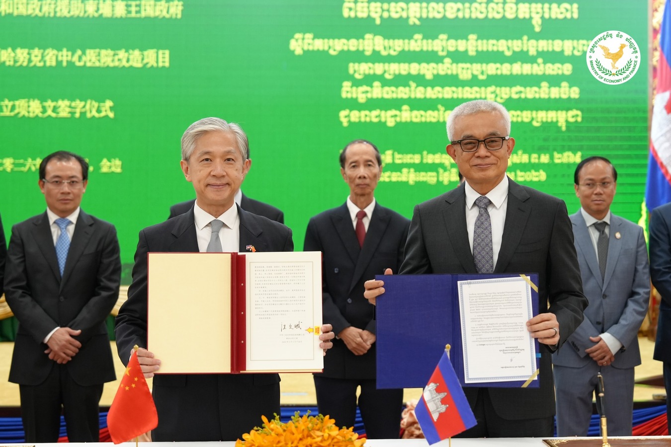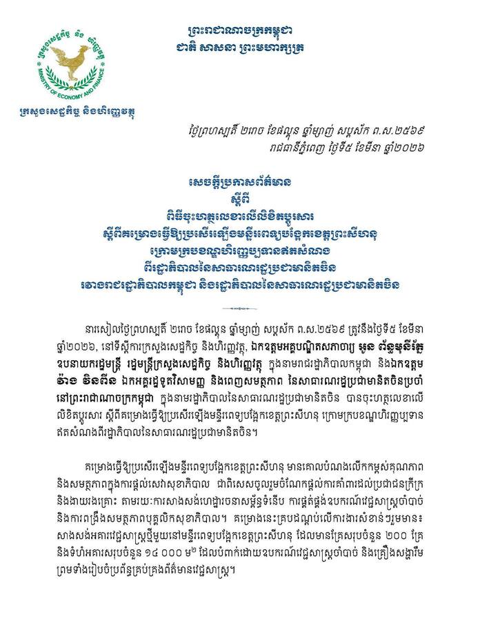 ភ្នំពេញ៖ ឯកឧត្តមអគ្គបណ្ឌិតសភាចារ្យ អូន ព័ន្ធមុនីរ័ត្ន ឧបនាយករដ្ឋមន្ត្រី រដ្ឋមន្ត្រីក្រសួងសេដ្ឋកិច្ច និងហិរញ្ញវត្ថុ ក្នុងនាមរាជរដ្ឋាភិបាលកម្ពុជា និងឯកឧត្តម វ៉ាង វិនពីន ឯកអគ្គរដ្ឋទូតវិសាមញ្ញ និងពេញសមត្ថភាព នៃសាធារណរដ្ឋប្រជាមានិតចិនប្រចាំនៅព្រះរាជាណាចក្រកម្ពុជា ក្នុងនាមរដ្ឋាភិបាលនៃសាធារណរដ្ឋប្រជាមានិតចិន បានចុះហត្ថលេខាលើលិខិតប្តូរសារ ស្តីពីគម្រោងធ្វើឱ្យប្រសើរឡើងមន្ទីរពេទ្យបង្អែកខេត្តព្រះសីហនុ ក្រោមក្របខណ្ឌហិរញ្ញប្បទានឥតសំណងពីរដ្ឋាភិបាលនៃសាធារណរដ្ឋប្រជាមានិតចិន, នារសៀលថ្ងៃទី៥ ខែមីនា ឆ្នាំ២០២៦, នៅទីស្តីការក្រសួងសេដ្ឋកិច្ច និងហិរញ្ញវត្ថុ។