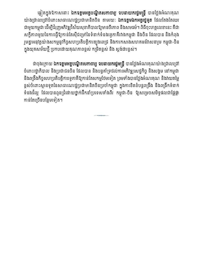 ឆ្លៀតក្នុងឱកាសនោះ លោក ឧបនាយករដ្ឋមន្ត្រី បានថ្លែងអំណរគុណ យ៉ាងជ្រាលជ្រៅចំពោះសាធារណរដ្ឋប្រជាមានិតចិន តាមរយៈ លោកឯកអគ្គរដ្ឋទូត ដែលតែងតែឈរ ជាមួយកម្ពុជា ដើម្បីជំរុញអភិវឌ្ឍវិស័យសុខាភិបាលឱ្យមានចីរភាព និងសមធម៌។
