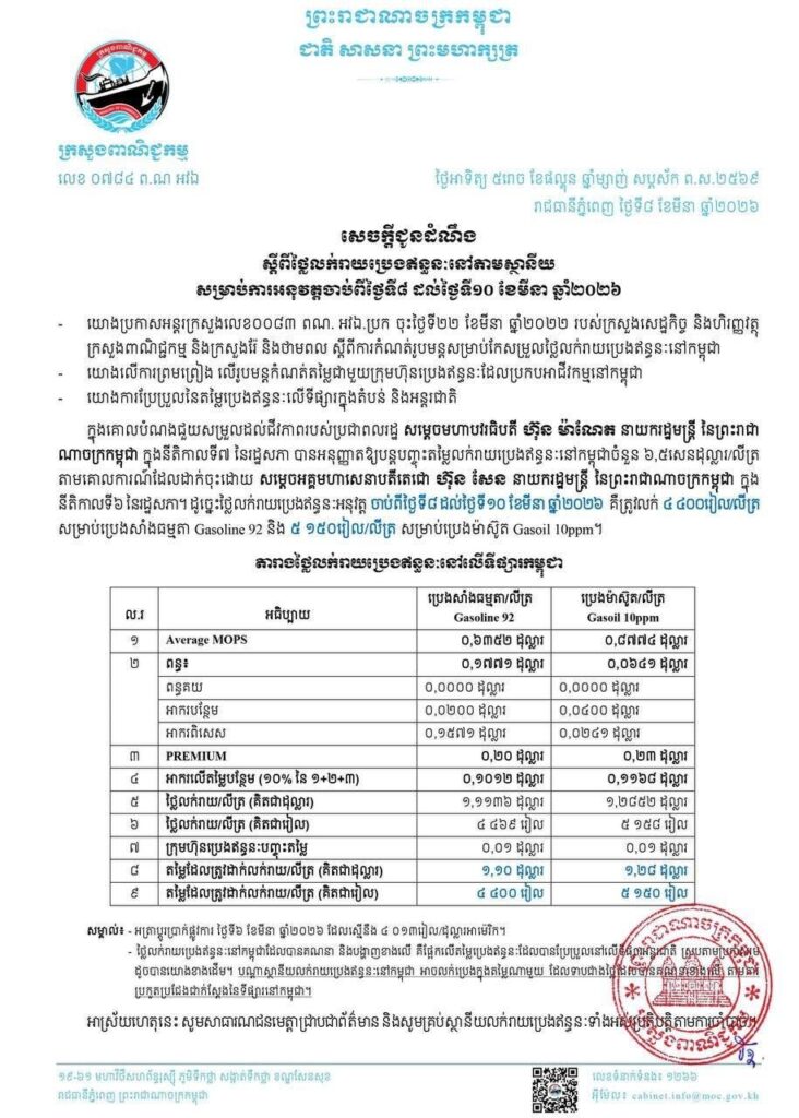 ក្រសួងពាណិជ្ជកម្ម ប្រកាសថា ចាប់ពីថ្ងៃទី៨-១០ មីនា តម្លៃប្រេងសាំងកើនឡើង ៤,៤០០រៀល និងម៉ាស៊ូត ៥,១៥០រៀល ក្នុងមួយលីត្រ