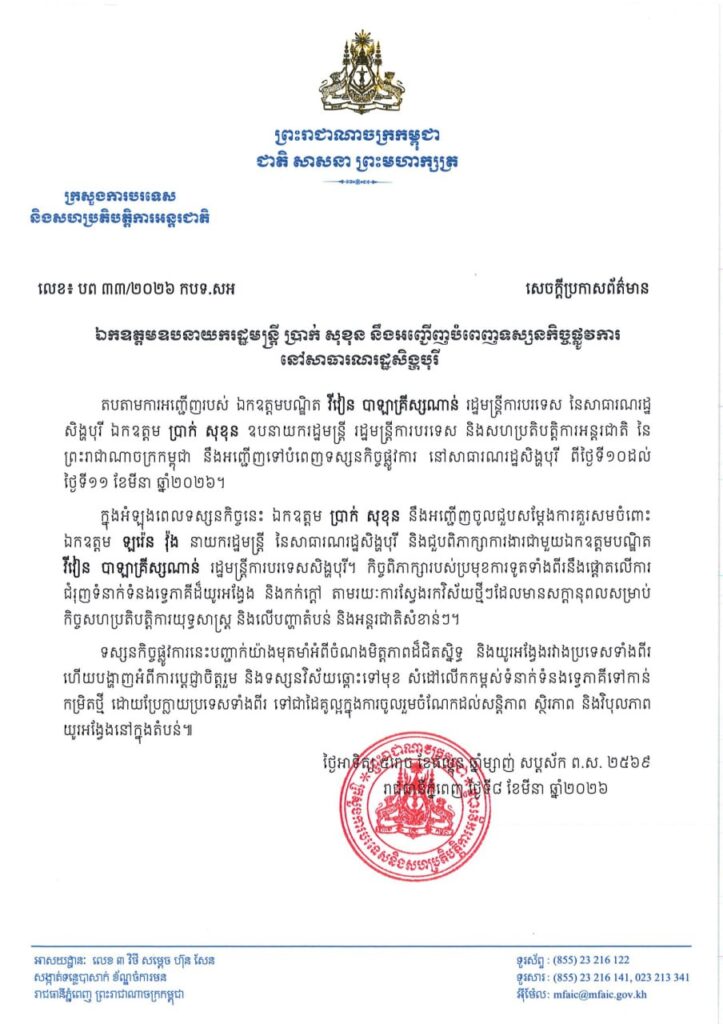 ភ្នំពេញ ៖ តបតាមការអញ្ជើញរបស់ លោកបណ្ឌិត វីរៀន បាឡាគ្រឹស្សណាន់ រដ្ឋមន្ត្រីការបរទេសសិង្ហបុរី, ឯកឧត្តម ប្រាក់ សុខុន ឧបនាយករដ្ឋមន្ត្រី រដ្ឋមន្ត្រីការបរទេស និងសហប្រតិបត្តិការអន្តរជាតិ នៃ ព្រះរាជាណាចក្រកម្ពុជា នឹងអញ្ជើញទៅបំពេញទស្សនកិច្ចផ្លូវការ នៅសាធារណរដ្ឋសិង្ហបុរី ពីថ្ងៃទី១០ដល់ ថ្ងៃទី១១ ខែមីនា ឆ្នាំ២០២៦។