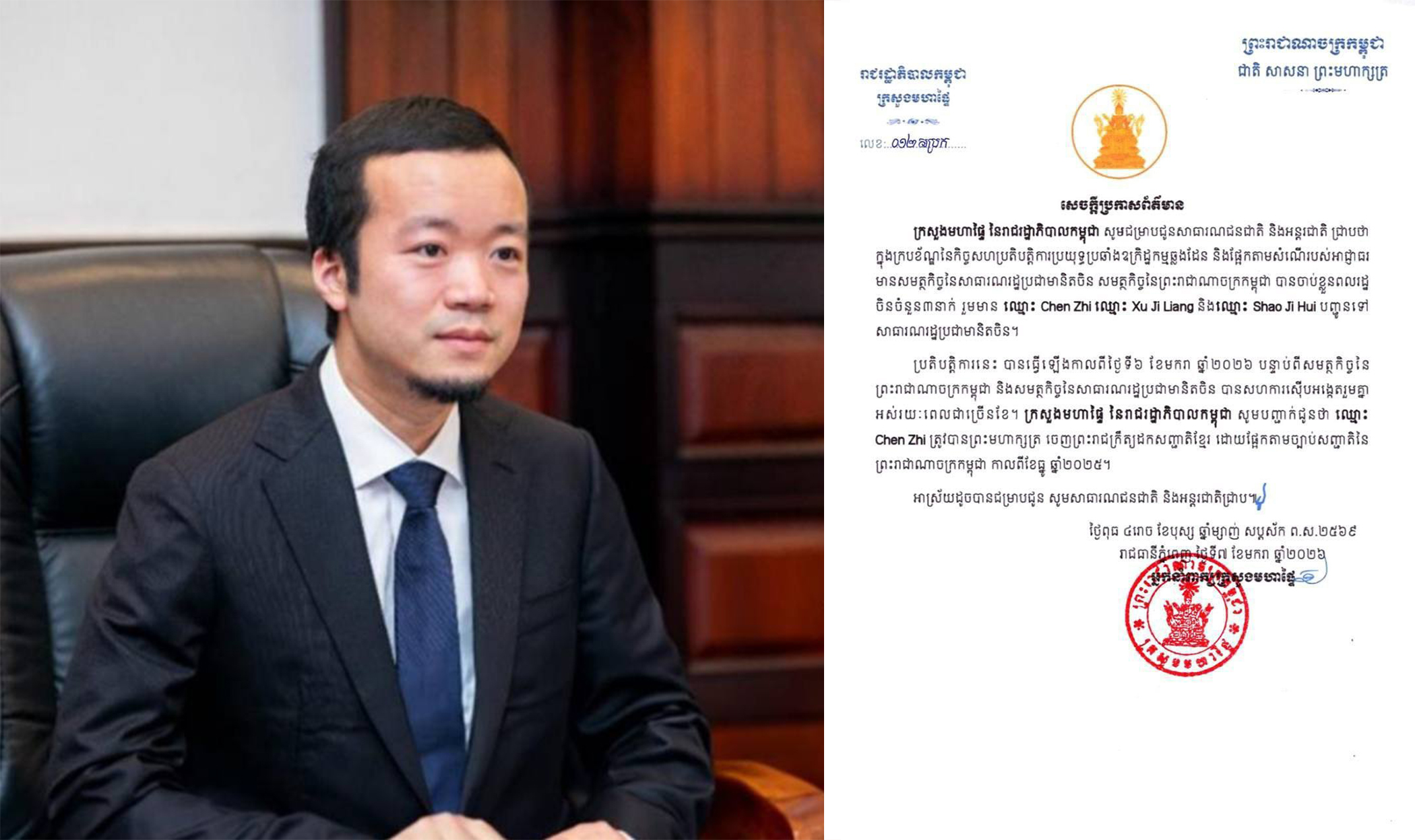អ្នកជំនួញដ៏ល្បាញល្បីរបស់ចិន អ្នកឧកញ៉ា ចេនហ្ស៊ី និងបក្ខពួក២នាក់ទៀត ត្រូវបានសមត្ថកិច្ចកម្ពុជា ចាប់ខ្លួន និងបញ្ជូនទៅប្រទេសចិន
