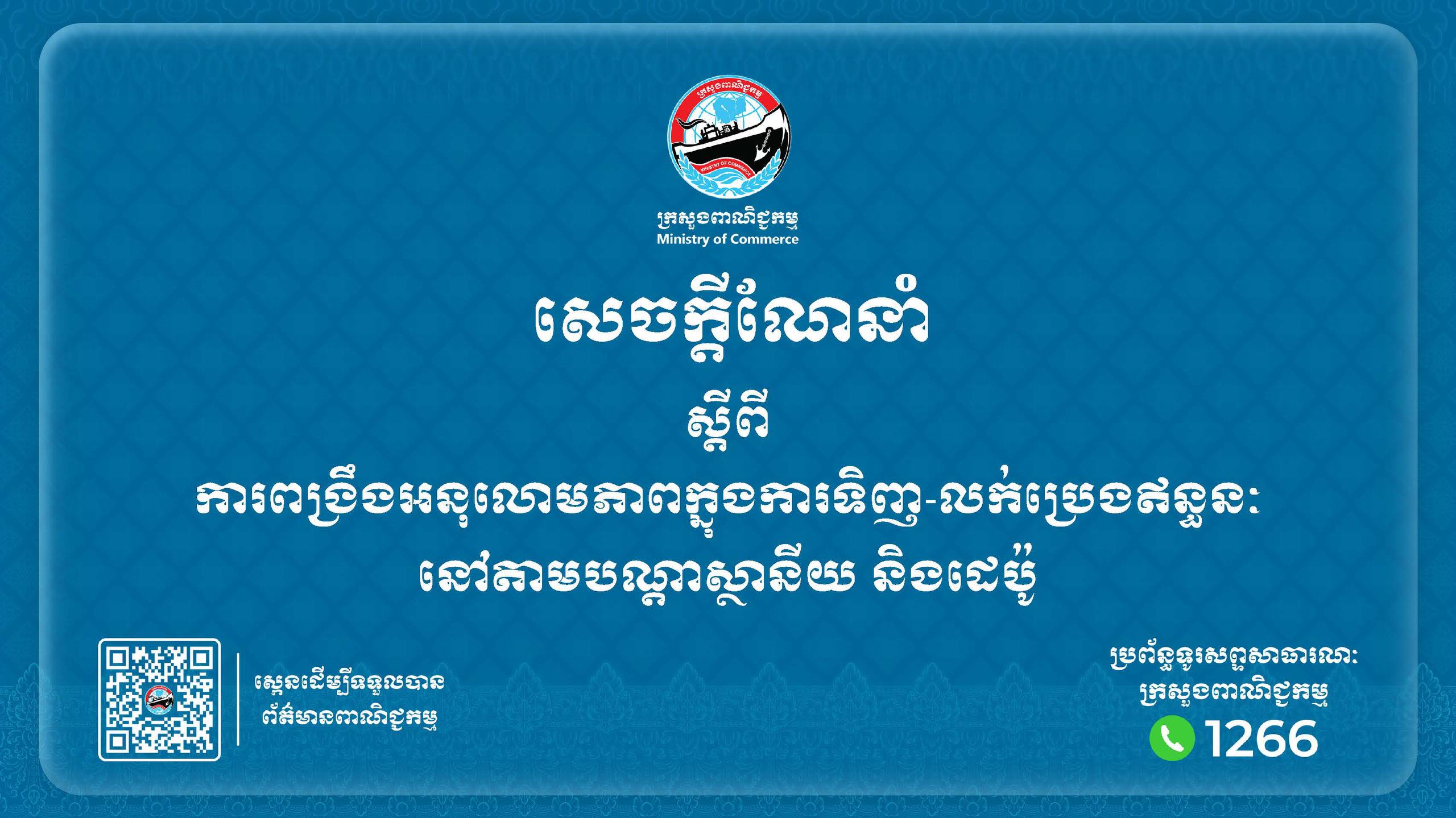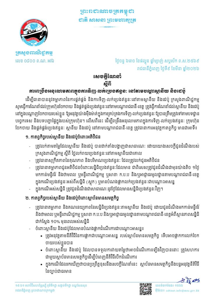 តាមតាមសេចក្ដីណែនាំរបស់ ក្រសួងពាណិជ្ជកម្ម នៅថ្ងៃទី៩ ខែមីនា ឆ្នាំ២០២៦ ថា ដើម្បីធានាបាននូវតម្លាភាព នៃការផ្គត់ផ្គង់ និងការទិញ-លក់ប្រេងឥន្ធនៈនៅតាមស្ថានីយ និងដេប៉ូ ក្រសួងពាណិជ្ជកម្ម បានធ្វើការណែនាំដល់ក្រុមហ៊ុនចែកចាយ និងផ្គត់ផ្គង់ប្រេងឥន្ធនៈ នៅតាមបណ្តារាជធានី-ខេត្ត ត្រូវធ្វើការណែនាំដល់ស្ថានីយ និងដេប៉ូ នៅក្នុងបណ្តាញចែកចាយរបស់ខ្លួន ឱ្យអនុវត្តយ៉ាងម៉ឺងម៉ាត់ ក្នុងការគ្រប់គ្រង ការទិញ-លក់ប្រេងឥន្ធនៈ ឱ្យបានត្រឹមត្រូវទៅតាមបទដ្ឋាន បច្ចេកទេស និងបទបញ្ជាផ្ទៃក្នុងរបស់ក្រុមហ៊ុន។