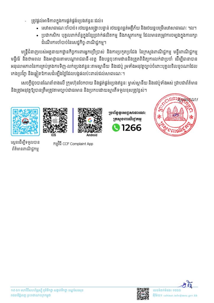 ភ្នំពេញ ៖ ក្រសួងពាណិជ្ជកម្ម បានណែនាំស្ថានីយ និងដេប៉ូលក់ប្រេងឥន្ធនៈ ត្រូវលក់តាមតម្លៃដែលក្រសួងដាក់តាំងបង្ហាញជាសាធារណៈ និងព្រមានអនុវត្តច្បាប់ ចំពោះបុគ្គលខិលខូចណាកេងប្រវ័ញ្ច និងឆ្លៀតឱកាសដំឡើងថ្លៃប្រេងឥន្ធនៈ។