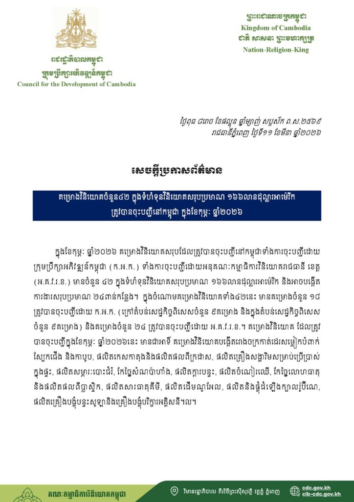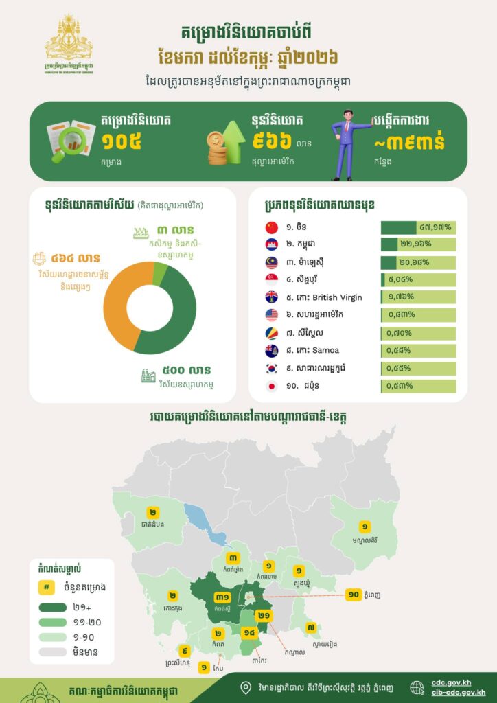 ភ្នំពេញ៖ យោងតាមសេចក្តីប្រកាសព័ត៌មានរបស់ CDC ឱ្យដឹងថា ២ខែដើមឆ្នាំ២០២៦នេះ គម្រោងវិនិយោគចំនួន១០៥ គម្រោងដែលមានទំហំទឹកប្រាក់ជាង៩៦៦ លានដុល្លារ ត្រូវបានក្រុមប្រឹក្សាអភិវឌ្ឍន៍កម្ពុជា (CDC) និងអនុគណៈកម្មាធិការវិនិយោគរាជធានី ខេត្ត (អ.គ.វ.រ.ខ.) អនុម័ត ដោយបង្កើតបានការងារបន្ថែមចំនួន៣៩ពាន់កន្លែង។