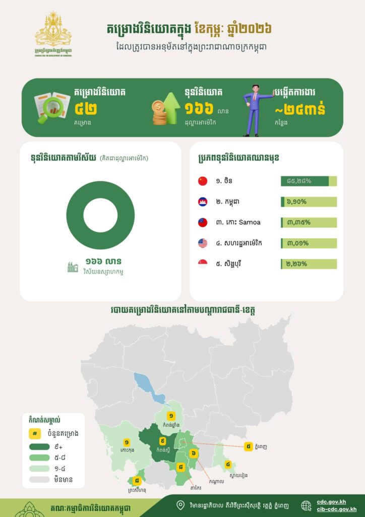 ដោយឡែកការចុះបញ្ជីក្នុងខែកុម្ភៈ មានចំនួន៤២គម្រោង មានទំហំទុនវិនិយោគសរុបប្រមាណ ១៦៦លានដុល្លារអាម៉េរិក និងអាចបង្កើតការងារសរុបប្រមាណ ២៤ពាន់កន្លែង។ ក្នុងចំណោមគម្រោងវិនិយោគទាំង៤២នេះ មានគម្រោងចំនួន ១៨ ត្រូវបានចុះបញ្ជីដោយ CDC ក្នុងនោះក្រៅតំបន់សេដ្ឋកិច្ចពិសេសចំនួន ៩គម្រោង និងក្នុងតំបន់សេដ្ឋកិច្ចពិសេស ចំនួន ៩គម្រោង និងគម្រោងចំនួន ២៤ទៀត ត្រូវបានចុះបញ្ជីដោយ អនុគណៈកម្មាធិការវិនិយោគរាជធានី ខេត្ត។