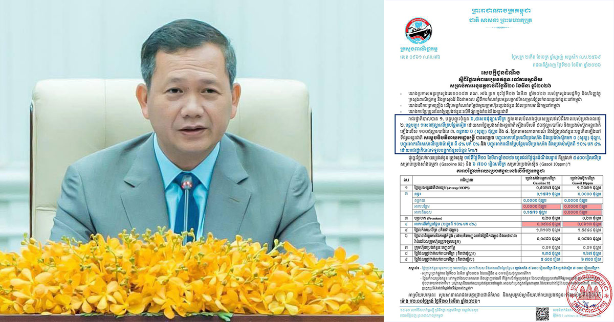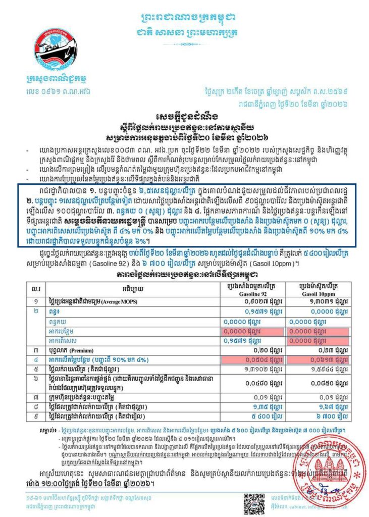 យោងតាមសេចក្តីប្រកាសព័ត៌មានស្តីពីតម្លៃលក់ប្រេងឥន្ធនៈរបស់ក្រសួងពាណិជ្ជកម្ម ដែលចេញផ្សាយនៅថ្ងៃទី២០ ខែមីនា ឆ្នាំ២០២៦ ក្នុងគោលបំណង ដើម្បីជួយសម្រួលដល់ជីវភាពរបស់ប្រជាពលរដ្ឋ រាជរដ្ឋាភិបាលកម្ពុជាក្រោមការដឹកនាំរបស់សម្តេចបវរធិបតី ហ៊ុន ម៉ាណែត នាយករដ្ឋមន្ត្រីបាន៖ ១- បន្តបញ្ចុះតម្លៃប្រេងឥន្ធនៈចំនួន ៦,៥សេនដុល្លារក្នុងមួយលីត្រ។ ២- បន្តបញ្ចុះមួយសេនដុល្លារក្នុងមួយលីត្របន្ថែមទៀត ដោយសារថ្លៃប្រេងសាំងឡើងលើសពី ៩០ ដុល្លារ/បារ៉ែល និងប្រេងម៉ាសូតអន្តរជាតិឡើងលើស ១០០ ដុល្លារ/បារ៉ែល។ ៣-ពន្ធគយ ០ (សូន្យ) ដុល្លារ និង៤-ផ្អែកតាមសភាពការណ៍ និងថ្លៃប្រេងឥន្ធនៈបន្តឡើងនៅទីផ្សារអន្តជាតិសម្តេចបវរធិបតីនាយករដ្ឋមន្ត្រី បានសម្រេច៖