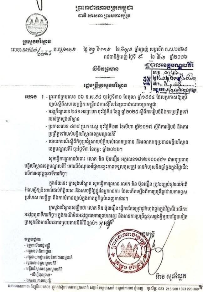 ភ្នំពេញ ៖ ឯកឧត្តមបណ្ឌិត អ៊ាង សុផល្លែត រដ្ឋមន្ត្រីក្រសួងបរិស្ថាន កាលពីថ្ងៃទី៩ ខែមីនា ឆ្នាំ២០២៦ បានព្រមានជាផ្លូវការទៅលើលោក ឌិន ប៊ុនធឿន អនុប្រធានមន្ទីរបរិស្ថានខេត្តមណ្ឌលគិរីពាក់ព័ន្ធនឹងការខ្វះភាពទទួលខុសត្រូវ និងកំហុសវិជ្ជាជីវៈក្នុងការអនុវត្តតួនាទីភារកិច្ច។