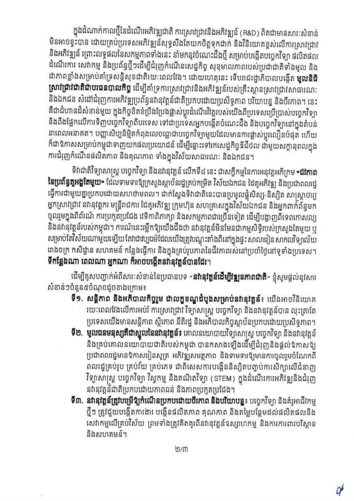 សារលិខិតសម្តេចធិបតី ហ៊ុន ម៉ាណែត ក្នុងឱកាសប្រារព្ធទិវាជាតិវិទ្យាសាស្ត្រ បច្ចេកវិទ្យា និងនវានុវត្តន៍ លើកទី៤