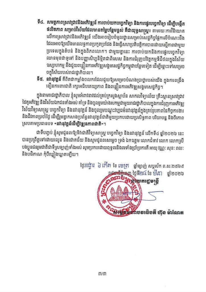 ភ្នំពេញ៖ សម្តេចមហាបវរធិបតី ហ៊ុន ម៉ាណែត នាយករដ្ឋមន្ត្រីនៃកម្ពុជា បានចេញសារលិខិតក្នុងឱកាសប្រារព្ធទិវាជាតិវិទ្យាសាស្ត្រ បច្ចេកវិទ្យា និងនវានុវត្តន៍ លើកទី៤ ថ្ងៃទី២៦ ដល់ថ្ងៃទី២៨ ខែមីនា ឆ្នាំ២០២៦។
