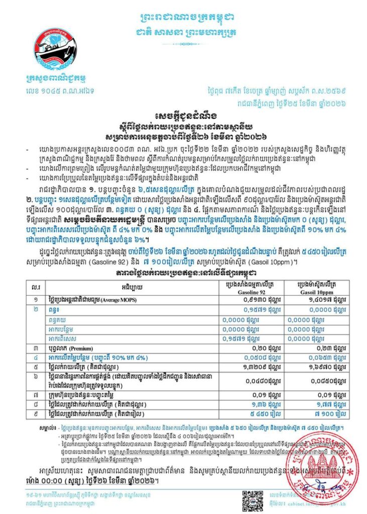 ភ្នំពេញ៖ តម្លៃប្រេងសម្រាប់ពីថ្ងៃទី២៦ ខែមីនា ឆ្នាំ២០២៦ រហូតដល់ថ្ងៃជូនដំណឹងបន្ទាប់
