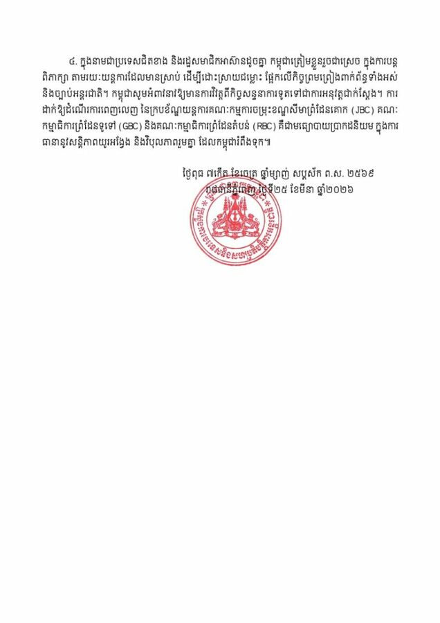 ប្រភពដដែល បានបន្តថា ការដាក់ឱ្យដំណើរការពេញលេញ នៃក្របខ័ណ្ឌយន្តការគណៈកម្មការចម្រុះខណ្ឌសីមាព្រំដែនគោក (JBC) គណៈកម្មាធិការព្រំដែនទូទៅ (GBC) និងគណៈកម្មាធិការព្រំដែនតំបន់ (RBC) គឺជាមធ្យោបាយប្រាកដនិយម ក្នុងការធានានូវសន្តិភាពយូរអង្វែង និងវិបុលភាពរួមគ្នា ដែលកម្ពុជារំពឹងទុក។