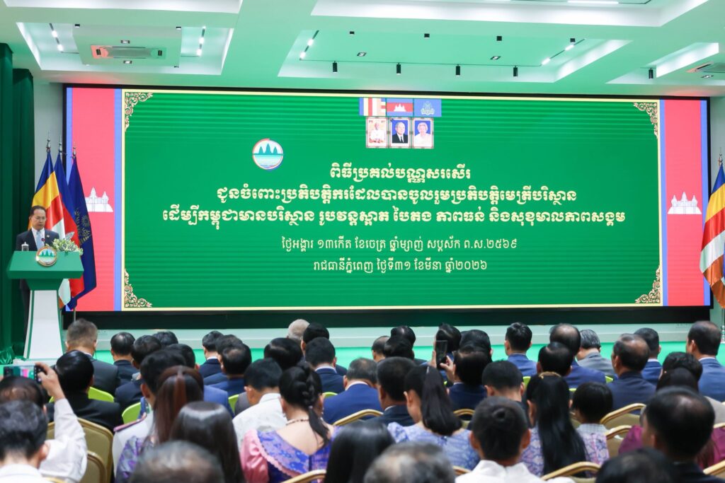 ភ្នំពេញ៖ ឯកឧត្តមបណ្ឌិត អ៊ាង សុផល្លែត រដ្ឋមន្ត្រីក្រសួងបរិស្ថាន បានអំពាវនាវឱ្យគ្រប់ភាគីពាក់ព័ន្ធ និងប្រជាពលរដ្ឋទាំងអស់ បន្តចូលរួមយ៉ាងសកម្មក្នុងយុទ្ធនាការនានា របស់ក្រសួងបរិស្ថាន ដើម្បីសម្អាតផ្ទះរបស់យើង ឱ្យមាន «ភាពស្អាត និងភាពបៃតង» ឆ្ពោះទៅសម្រេចបាននូវគោលដៅកម្ពុជា ជាប្រទេសអព្យាក្រឹតកាបូននៅឆ្នាំ២០៥០។ នេះជាការជំរុញការអនុវត្តយុទ្ធសាស្រ្តចក្រាវិស័យបរិស្ថាន ដែលឯកឧត្តមរដ្ឋមន្រ្តីបានមានប្រសាសន៍ នៅក្នុងឱកាសអញ្ជើញជាអធិបតី កម្មវិធីលើកទឹកចិត្តប្រតិបត្តិករមេត្រីបរិស្ថាន ឆ្នាំ២០២៦ ដែលបានប្រព្រឹត្តទៅ នារសៀលថ្ងៃទី៣១ ខែមីនា ឆ្នាំ ២០២៦ នៅទីស្តីការក្រសួងបរិស្ថាន។