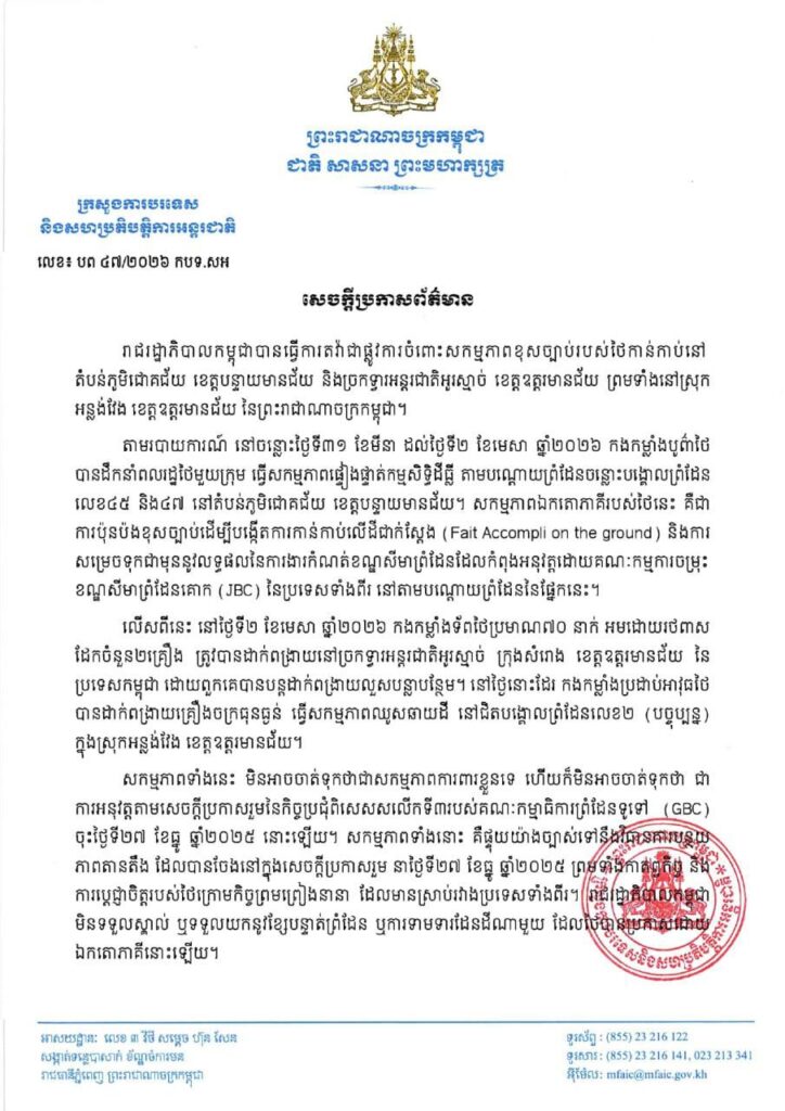 ក្រសួងការបរទេសកម្ពុជា បានឱ្យដឹងថា នៅចន្លោះថ្ងៃទី៣១ ខែមីនា ដល់ថ្ងៃទី២ ខែមេសា ឆ្នាំ២០២៦ កងកម្លាំងបូព៌ាថៃ បានដឹកនាំពលរដ្ឋថៃមួយក្រុមធ្វើសកម្មភាពផ្ទៀងផ្ទាត់កម្មសិទ្ធិដីធ្លីតាមបណ្ដោយព្រំដែនចន្លោះបង្គោលព្រំដែនលេខ៤៥ និង៤៧ នៅតំបន់ភូមិជោគជ័យ ខេត្តបន្ទាយមានជ័យ។