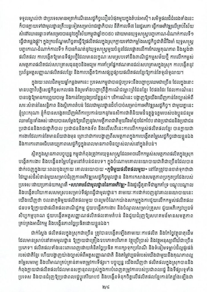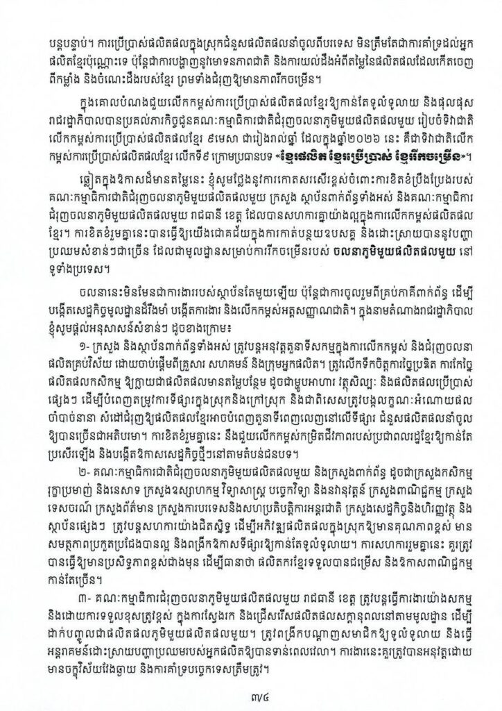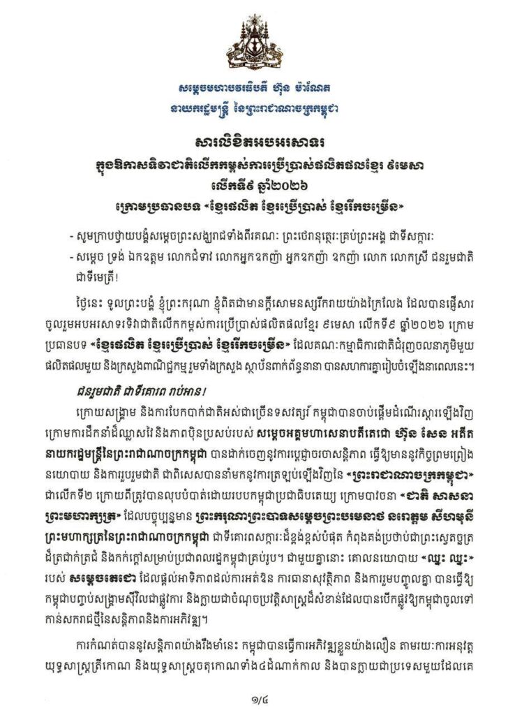ភ្នំពេញ៖ សម្តេចបវរធិបតី ហ៊ុន ម៉ាណែត នាយករដ្ឋមន្ត្រីនៃកម្ពុជា បានចេញសារលិខិតអបអរសាទរ ក្នុងឱកាសទិវាជាតិលើកកម្ពស់ការប្រើប្រាស់ផលិតផលខ្មែរ ៩មេសា លើកទី៩ ឆ្នាំ២០២៦ ក្រោមប្រធានបទ «ខ្មែរផលិត ខ្មែរប្រើប្រាស់ ខ្មែររីកចម្រើន»។