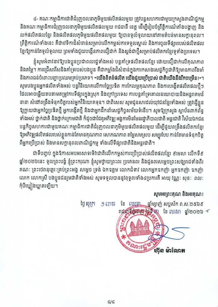 សម្តេចធិបតី ហ៊ុន ម៉ាណែត ចេញសារលិខិតអបអរសាទរ ក្នុងឱកាសទិវាជាតិលើកកម្ពស់ការប្រើប្រាស់ផលិតផលខ្មែរ ៩មេសា លើកទី៩ ឆ្នាំ២០២៦ ក្រោមប្រធានបទ «ខ្មែរផលិត ខ្មែរប្រើប្រាស់ ខ្មែររីកចម្រើន»