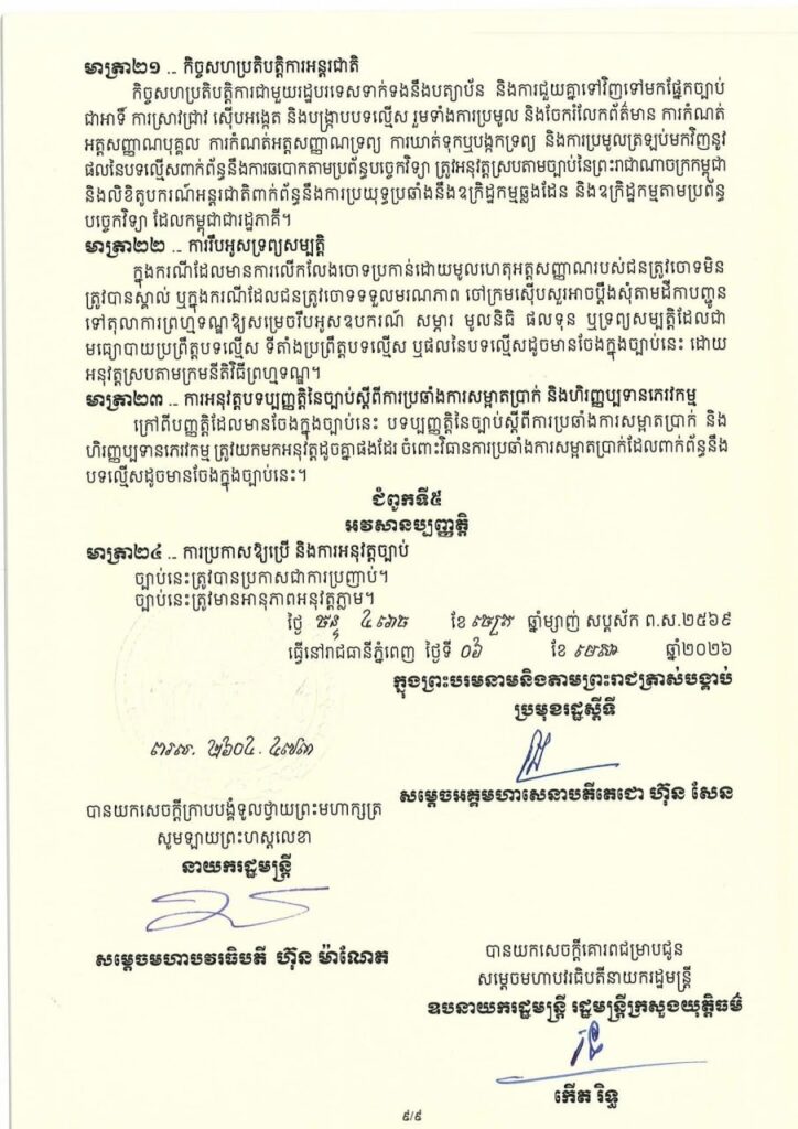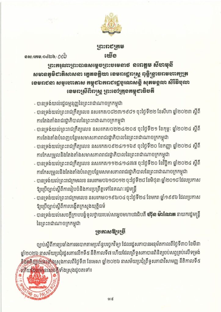 ភ្នំពេញ ៖ សម្តេចតេជោ ហ៊ុន សែន ប្រមុខរដ្ឋស្តីទី នៅថ្ងៃទី០៦ ខែមេសា ឆ្នាំ២០២៦ បានចេញព្រះរាជក្រម ប្រកាសឱ្យប្រើច្បាប់ ស្តីពី ការប្រឆាំងការឆបោកតាមប្រព័ន្ធបច្ចេកវិទ្យា ដែលរដ្ឋសភាបានអនុម័តកាលពីថ្ងៃទី៣០ ខែមីនា ឆ្នាំ២០២៦ នាសម័យប្រជុំរដ្ឋសភាលើកទី៥ នីតិកាលទី៧ ហើយព្រឹទ្ធសភាបានពិនិត្យចប់សព្វគ្រប់លើទម្រង់ និងគតិ ច្បាប់នេះទាំងស្រុងកាលពីថ្ងៃទី៣ ខែមេសា ឆ្នាំ២០២៦ នាសម័យប្រជុំព្រឹទ្ធសភាជាវិសាមញ្ញ នីតិកាលទី៥៕
