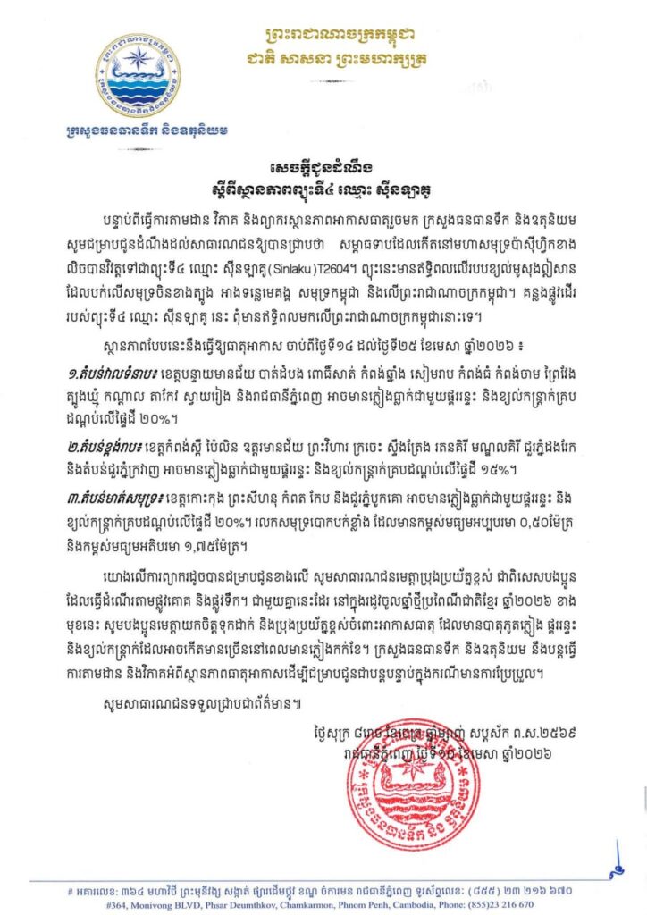 ភ្នំពេញ៖ ក្រសួងធនធានទឹកនិងឧតុនិយម បានចេញសេចក្តីជូនដំណឹង ស្តីពីស្ថានភាពព្យុះទី៤ ឈ្មោះ ស៊ីនឡាគូ (Sinlaku)T2604 ដែលនាំឱ្យតំបន់មួយចំនួន ក្នុងប្រទេសកម្ពុជានឹងអាចមានភ្លៀងធ្លាក់ជាមួយផ្គររន្ទះ និងខ្យល់កន្ត្រាក់គ្របដណ្ដប់លើផ្ទៃដី ១៥ទៅ២០% ចាប់ពីថ្ងៃទី១៤ ដល់ថ្ងៃទី២៥ ខែមេសា ឆ្នាំ២០២៦។