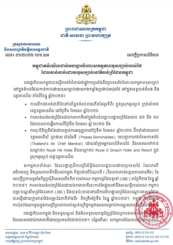 ក្រសួងការបរទេស និងសហប្រតិបត្តិការអន្ដរជាតិ នៅថ្ងៃទី១០ ខែមេសា ឆ្នាំ២០២៦នេះ បានសេចក្ដីប្រកាសព័ត៌មាន បង្ហាញអំពីការតវ៉ាចំពោះសកម្មភាពរបស់ភាគីថៃរួមមាន៖