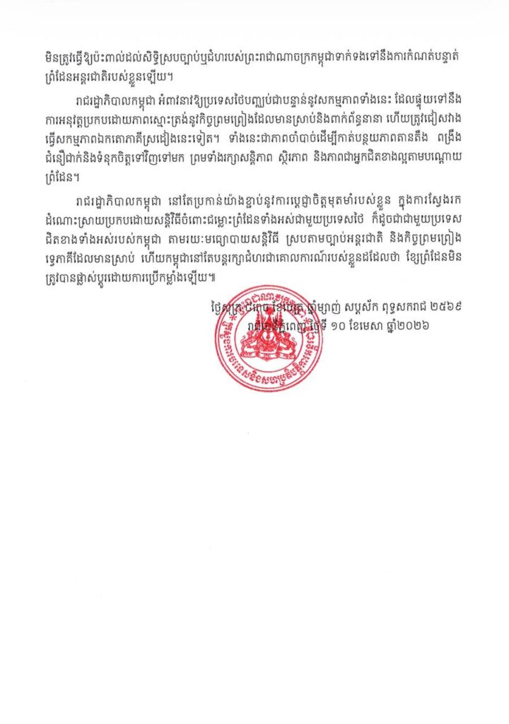 រាជរដ្ឋាភិបាលកម្ពុជា នៅតែប្រកាន់យ៉ាងខ្ជាប់នូវការប្តេជ្ញាចិត្តមុតមាំរបស់ខ្លួន ក្នុងការស្វែងរកដំណោះស្រាយ ប្រកបដោយសន្តិវិធីចំពោះជម្លោះព្រំដែនទាំងអស់ ជាមួយប្រទេសថៃ ក៏ដូចជាជាមួយប្រទេសជិតខាងទាំងអស់របស់កម្ពុជា តាមរយៈមធ្យោបាយសន្តិវិធីស្របតាមច្បាប់អន្តរជាតិ និងកិច្ចព្រមព្រៀងទ្វេភាគីដែលមានស្រាប់ហើយកម្ពុជា នៅតែបន្តរក្សាជំហរជាគោលការណ៍របស់ខ្លួនដដែលថា ខ្សែព្រំដែនមិនត្រូវបានផ្លាស់ប្តូរដោយការប្រើកម្លាំងឡើយ៕