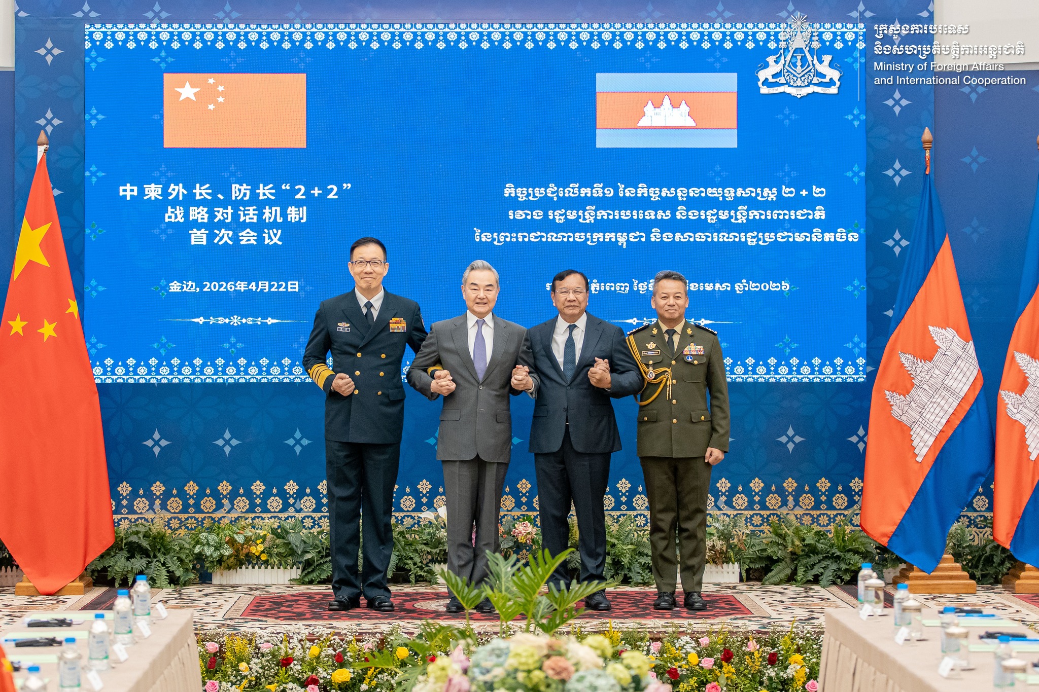 សូមរំលឹកថា នៅរសៀលថ្ងៃទី២២ ខែមេសា ឆ្នាំ២០២៦ ឧបនាយករដ្ឋមន្រ្តី ប្រាក់ សុខុន រដ្ឋមន្រ្តី ការបរទេស និងសហប្រតិបត្តិការអន្តរជាតិ និងឧបនាយករដ្ឋមន្រ្តី ទៀ សីហា រដ្ឋមន្រ្តីការពារជាតិ នៃព្រះរាជាណាចក្រកម្ពុជា ជាមួយ លោក វ៉ាង យី រដ្ឋមន្រ្តីការបរទេស និងលោក តុង ជុន រដ្ឋមន្រ្តីការពារជាតិ នៃសាធារណរដ្ឋប្រជាមានិតចិន បានធ្វើជាសហប្រធានកិច្ចប្រជុំលើកទី១នៃកិច្ចសន្ទនាយុទ្ធសាស្ត្រ “២+២” រវាងរដ្ឋមន្រ្តីការបរទេស និងរដ្ឋមន្រ្តីការពារជាតិនៃកម្ពុជា និងចិន នៅរាជធានីភ្នំពេញ៕