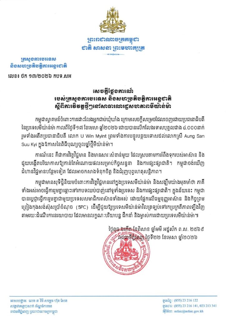 ភ្នំពេញ ៖ កម្ពុជា បានស្វាគមន៍ចំពោះការដោះលែងអ្នកជាប់ឃុំឃាំង ក្រោមសេចក្តីសម្រេចដែលចេញដោយប្រធានាធិបតី នៃប្រទេសមីយ៉ាន់ម៉ា កាលពីថ្ងៃទី១៧ ខែមេសា ឆ្នាំ២០២៦ ដោយបានលើកលែងទោសបុគ្គលជាង ៤.០០០នាក់ រួមទាំងអតីតប្រធានាធិបតី លោក U Win Myint ព្រមទាំងការបន្ធូរបន្ថយទោសដល់លោកស្រី Aung San Suu Kyi ក្នុងឱកាសនៃពិធីបុណ្យចូលឆ្នាំថ្មីមីយ៉ាន់ម៉ា។