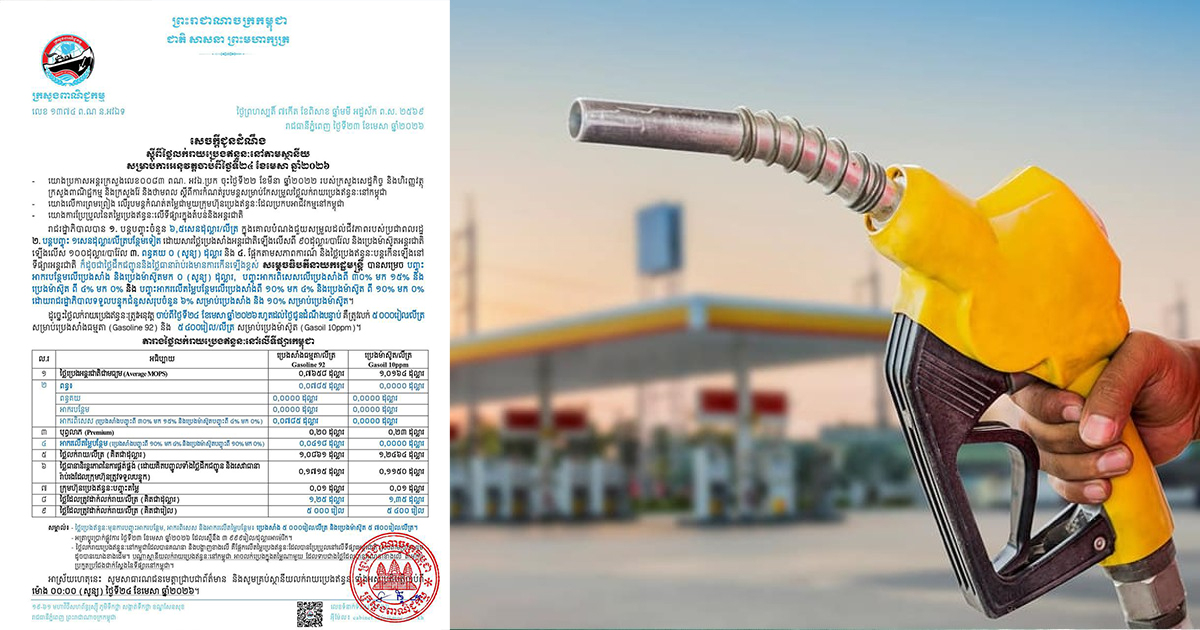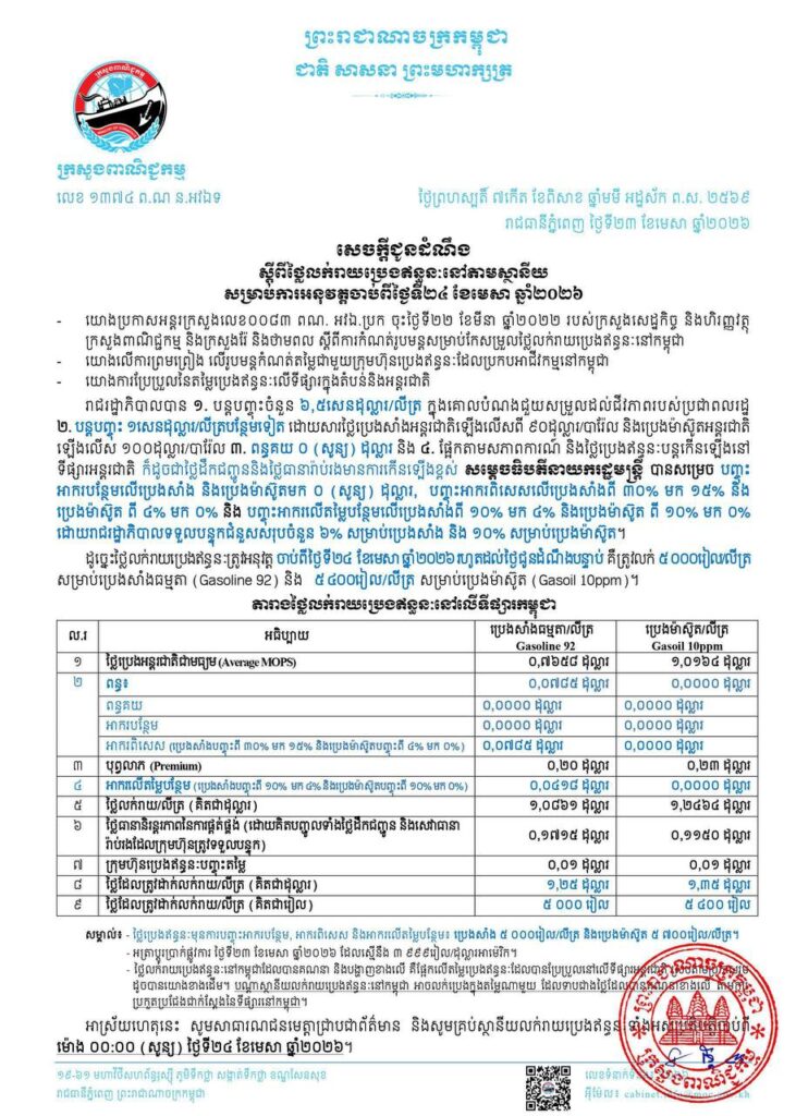 ភ្នំពេញ៖ ក្រសួងពាណិជ្ជកម្ម បានចេញសេចក្តីជូនដំណឹង ស្តីពី ថ្លៃលក់រាយប្រេងឥន្ធនៈនៅតាមស្ថានីយ សម្រាប់ការអនុវត្តចាប់ពីម៉ោង ០០:០០ (សូន្យ) ថ្ងៃទី២៤ ខែមេសា ឆ្នាំ២០២៦។