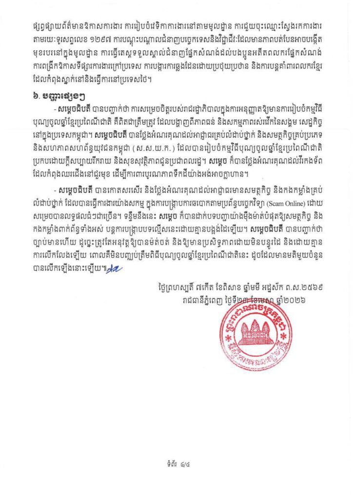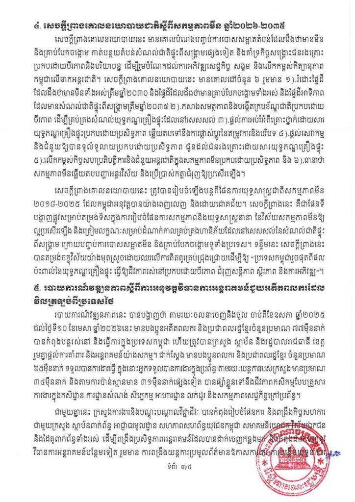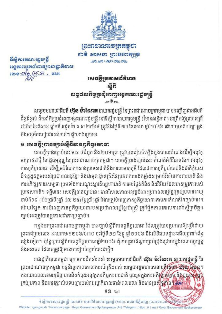 ភ្នំពេញ ៖ កិច្ចប្រជុំពេញអង្គគណៈរដ្ឋមន្ត្រី ក្រោមអធិបតីភាព សម្ដេចធិបតី ហ៊ុន ម៉ាណែត នាយករដ្ឋមន្ដ្រីនៃកម្ពុជា នាថ្ងៃទី២៣ ខែមេសា ឆ្នាំ២០២៦ បានសម្រេចអនុម័តសេចក្តីព្រាងច្បាប់ ស្តីពី កាតព្វកិច្ចយោធា និងត្រូវបានប្រកាសជាការប្រញាប់។