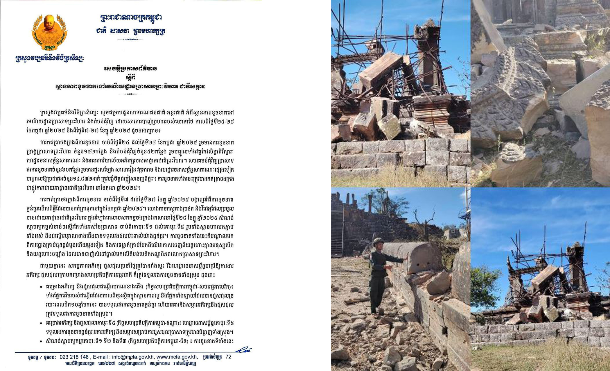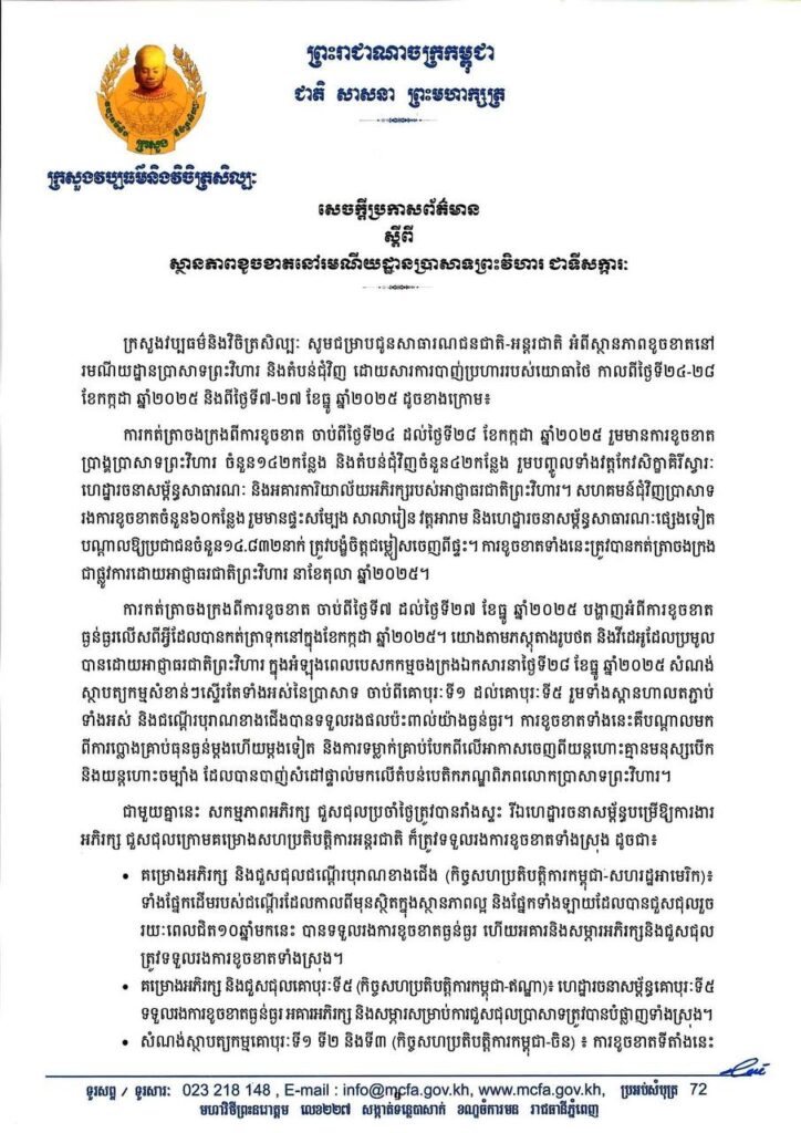 ក្រសួងវប្បធម៌ចេញសេចក្តីប្រកាសព័ត៌មាន ស្តីពីស្ថានភាពខូចខាតនៅរមណីយដ្ឋានប្រាសាទព្រះវិហារ ជាទីសក្ការៈ