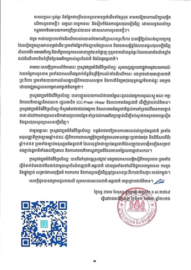 ភ្នំពេញ៖ ក្រសួងវប្បធម៌ចេញសេចក្តីប្រកាសព័ត៌មាន ស្តីពីស្ថានភាពខូចខាតនៅរមណីយដ្ឋានប្រាសាទព្រះវិហារ ជាទីសក្ការៈ។