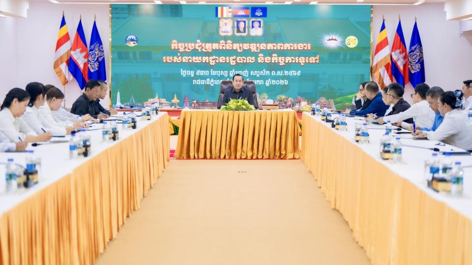 ភ្នំពេញ៖ ឯកឧត្តម ហួត ហាក់ រដ្ឋមន្ត្រីក្រសួងទេសចរណ៍ នៅថ្ងៃទី១២ ខែមករា ឆ្នាំ២០២៦ អញ្ជើញដឹកនាំកិច្ចប្រជុំពិនិត្យវឌ្ឍនភាពការងាររបស់នាយកដ្ឋានរដ្ឋបាល និងកិច្ចការទូទៅ ក្នុងគោលបំណងពង្រឹងសមត្ថភាពលើការងាររដ្ឋបាល សុវត្ថិភាពឯកសារដ្ឋបាល សន្តិសុខ សណ្តាប់ធ្នាប់ និងការងារពិធីការ ដោយធ្វើការវាយតម្លៃលើចំណុចខ្លាំង ចំណុចខ្វះខាត បញ្ហាប្រឈម ឆ្លើយតបនឹងសំណូមពរ និងដាក់ចេញនូវទិសដៅការងារបន្ត។